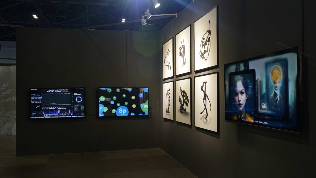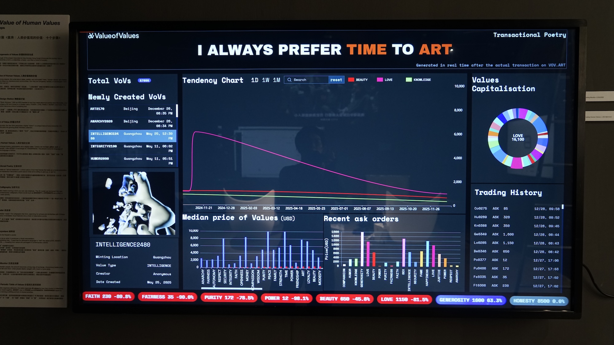The work invites visitors to become « Brain Workers ». Then, using EEG headsets, to shape 3D forms from their own brainwaves. Each form is linked to a chosen human value such as LOVE, POWER, FAMILY, or MONEY. These forms are minted as digital tokens on the blockchain, entering a living economy where values can be kept, gifted, sold, or bartered. Every transaction generates a piece of Transactional Poetry: an ethical statement that reframes the deal as a moral proposition. Through Crypto Calligraphy, an AI Reader, and the AI Interpreters, the work bridges neuroscience, Chinese calligraphic tradition, and the language of contemporary markets. A final Periodic Table of 42 Values maps how human priorities cluster, travel, and shift, forming a collective portrait of what we, as indues, citizens, nationals, truly care about.