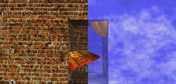 | La base de données architecturale est reconstruite à chaque image. Le spectateur peut choisir toutes les directions dans le plan horizontal. Les couloirs construits restent en mémoire et peuvent se recouper jusqu'à constituer un espace architecturé d'une grande complexité. Nous effectuons donc l'équivalent d'opérations booléennes en temps réel. D'autre part, la matière dans laquelle nous creusons est une texture 3D, c'est à dire qu'elle reste cohérente quelque soit l'axe de coupe. Dans Dieu est-il plat ? nous creusons dans de la brique, dans Le Diable est-il courbe ? nous creusons dans le ciel bleu parsemé de nuages blancs. Dans Et moi dans tout ça ? (sur Internet) nous ne creusons plus du tout, et ce n'est pas plus mal. | ||