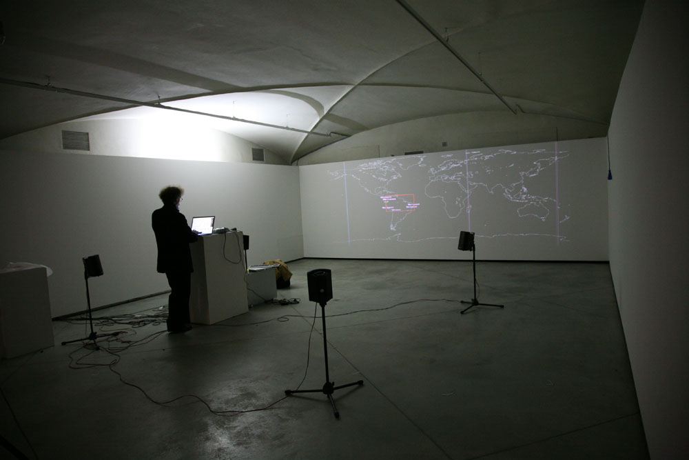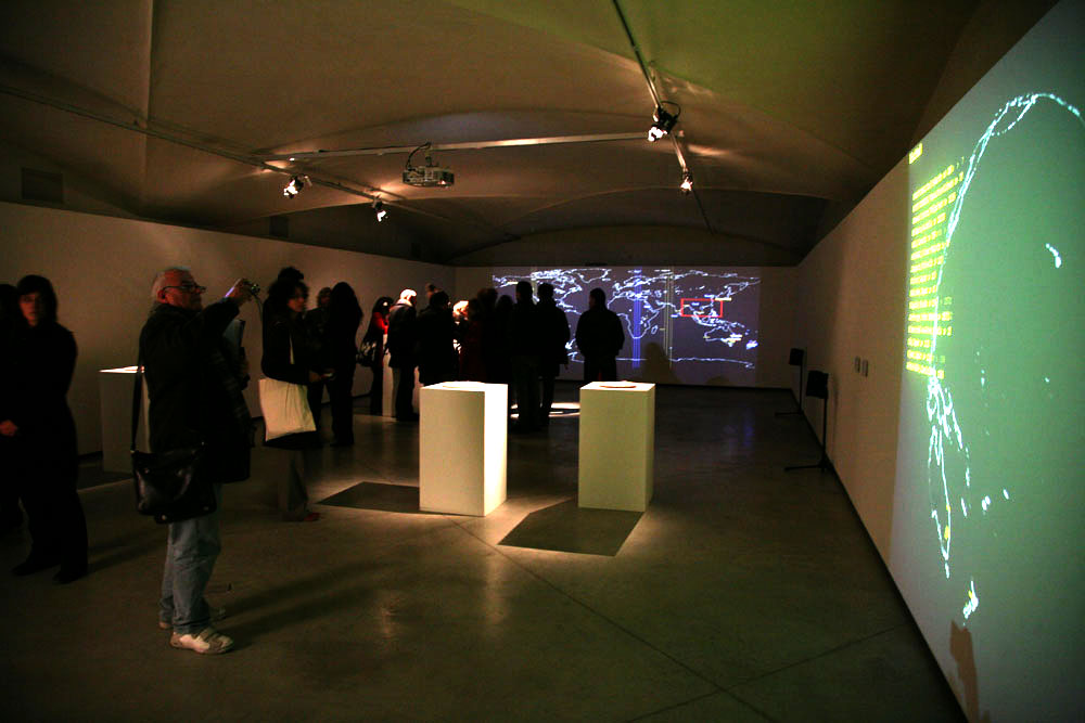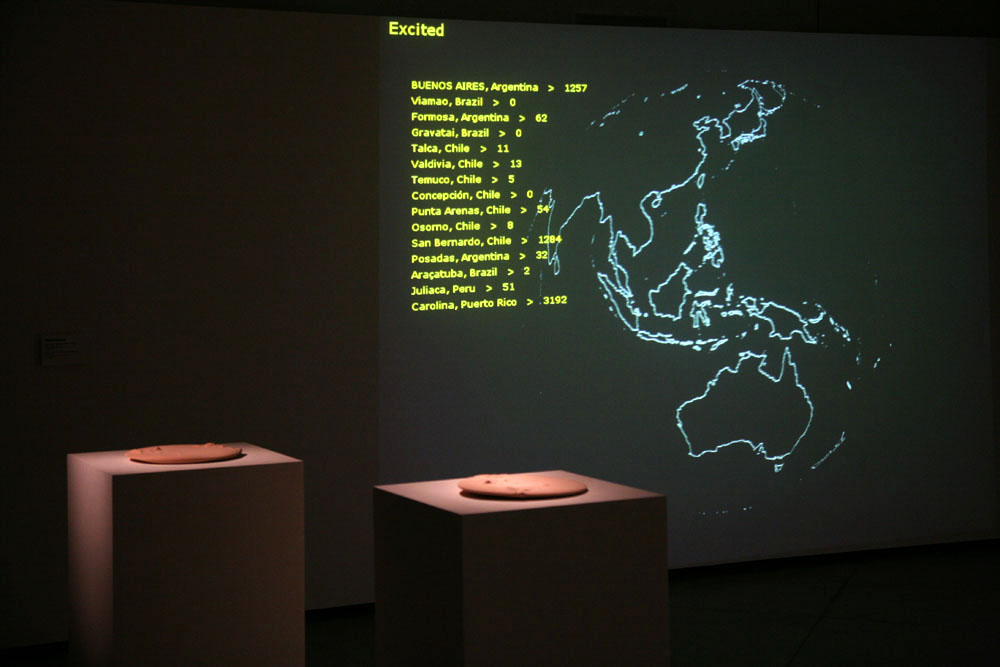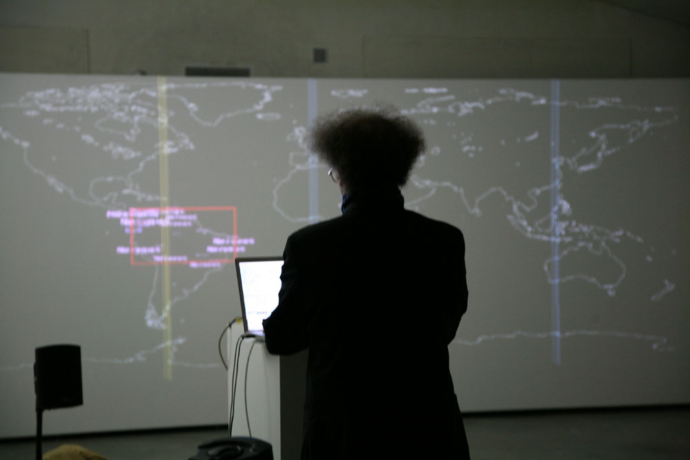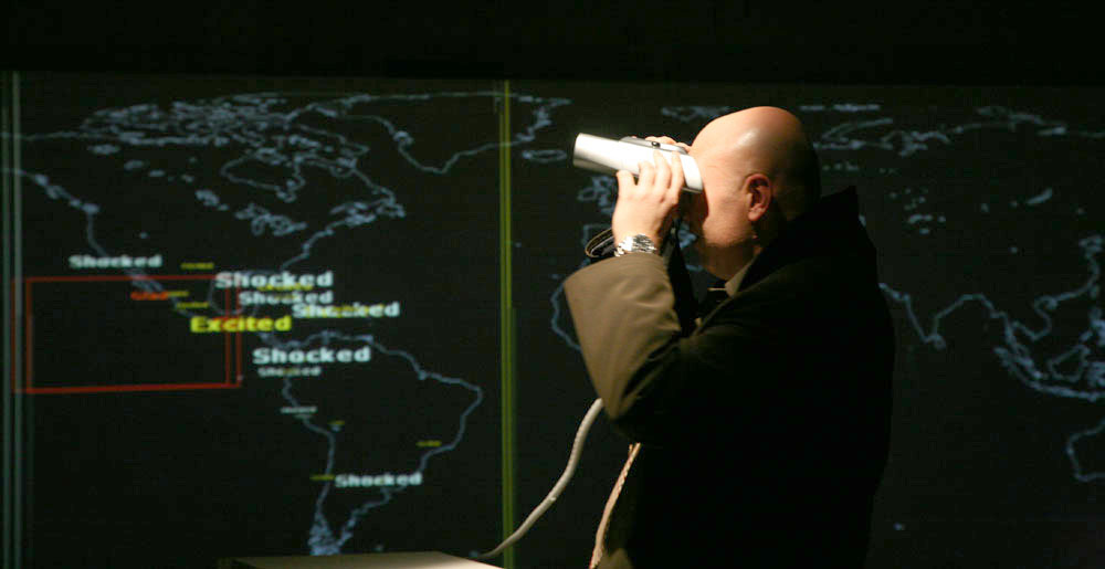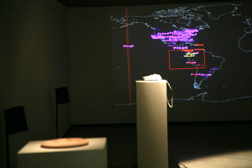 Seen as the world nervous system, the Net should now be the best way to know where pain and pleasure are located on the planet. Googling the news on the Web then becomes a way to get real-time images of the world state of mind. Mechanics of Emotions a series of works that uses such data from the web, builds dynamic maps of the world’s emotions e-Spotting (Emotion Spotting) Internet-Music performance, and now –seen at the exhibition at the Palazzo Strozzi- an art installation turns the map of world emotions into a music scoreThe World Emotional Mapping real-time maps of world emotions from the Net maps made up of words, words as big as the number of hits related to the 3200 biggest cities emotions around the worldMixing-by-Watching When in the installation, visitors use VR binoculars to visually explore the maps, from inside the globe. They select-by- watching the zones of the world that will reveal their emotional states of minds. And watching, through observing the world, becomes a way to mix up feelings and produce a euphoric, enigmatic, or pathetic music from it.