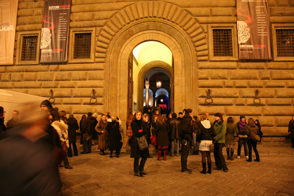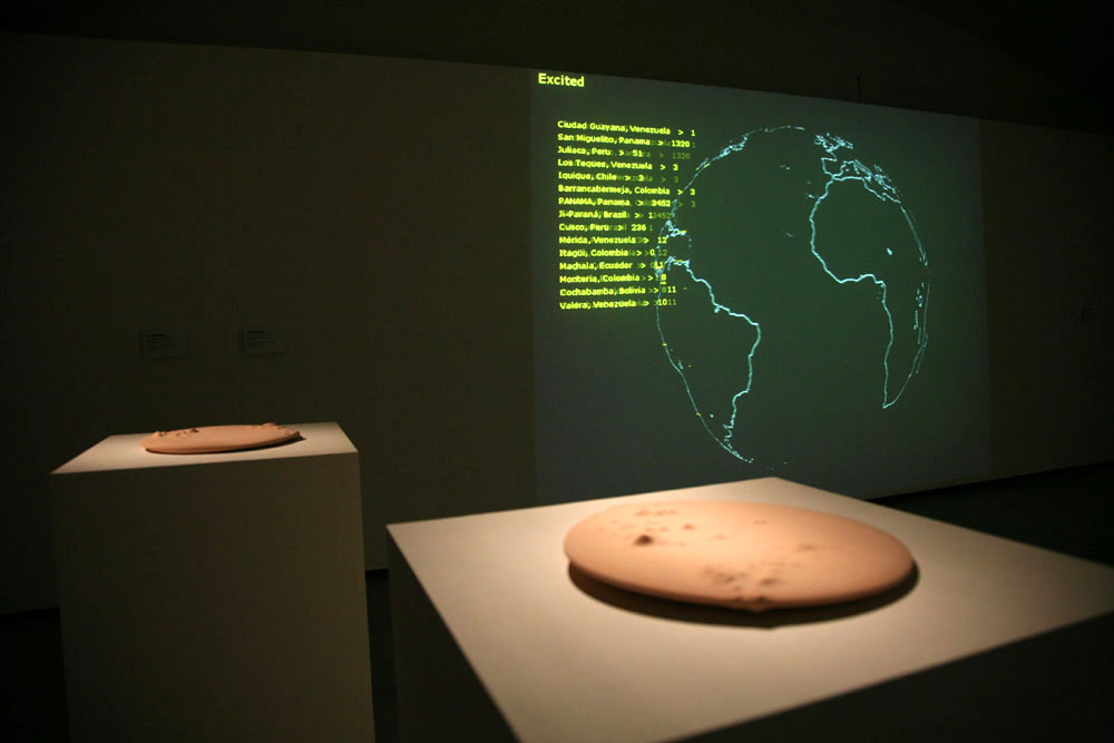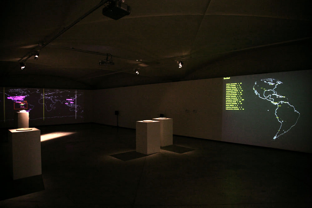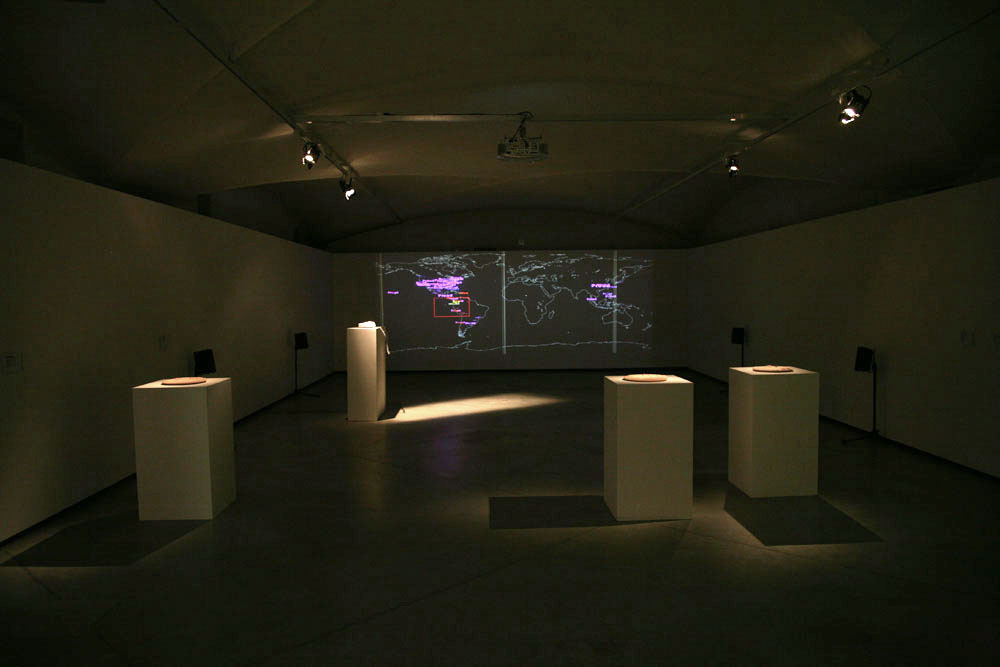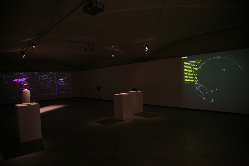 Seen as the world nervous system, the Net should now be the best way to know where pain and pleasure are located on the planet. Googling the news on the Web then becomes a way to get real-time images of the world state of mind. Mechanics of Emotions a series of works that uses such data from the web, builds dynamic maps of the world’s emotions e-Spotting (Emotion Spotting) Internet-Music performance, and now –seen at the exhibition at the Palazzo Strozzi- an art installation turns the map of world emotions into a music scoreThe World Emotional Mapping real-time maps of world emotions from the Net maps made up of words, words as big as the number of hits related to the 3200 biggest cities emotions around the worldMixing-by-Watching When in the installation, visitors use VR binoculars to visually explore the maps, from inside the globe. They select-by- watching the zones of the world that will reveal their emotional states of minds. And watching, through observing the world, becomes a way to mix up feelings and produce a euphoric, enigmatic, or pathetic music from it.