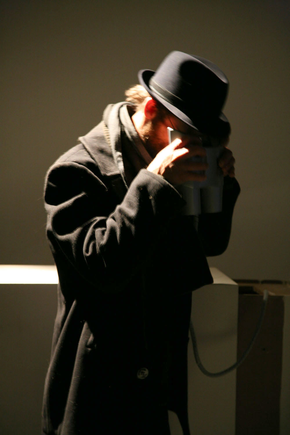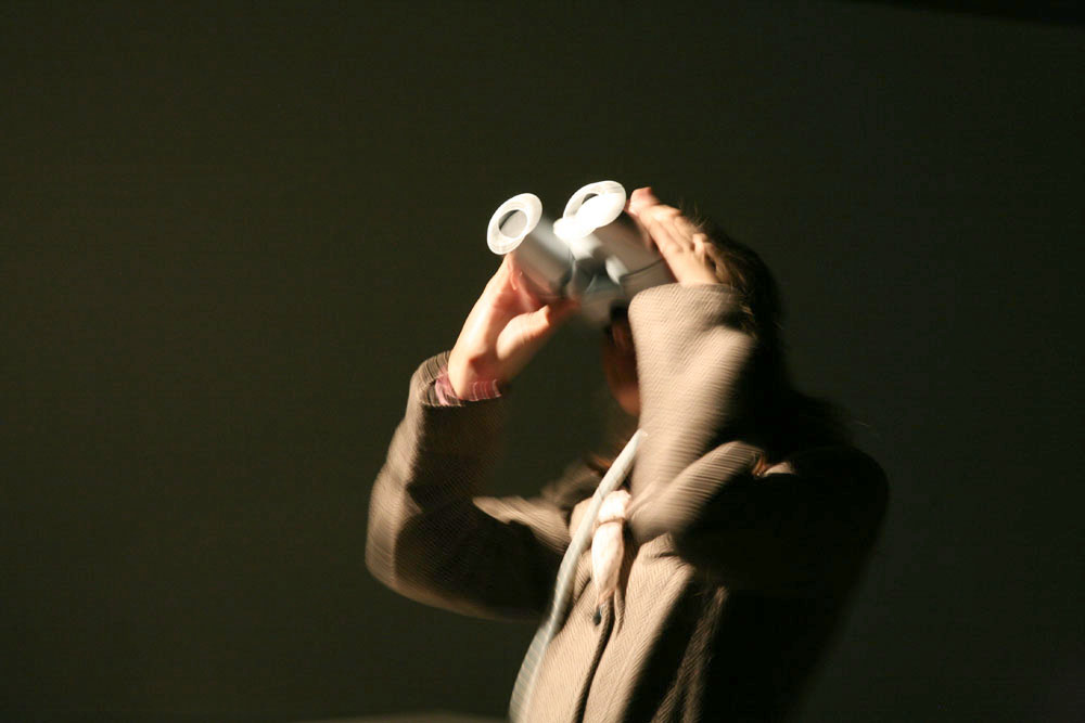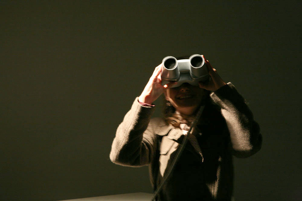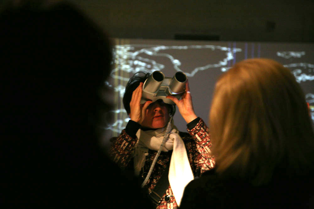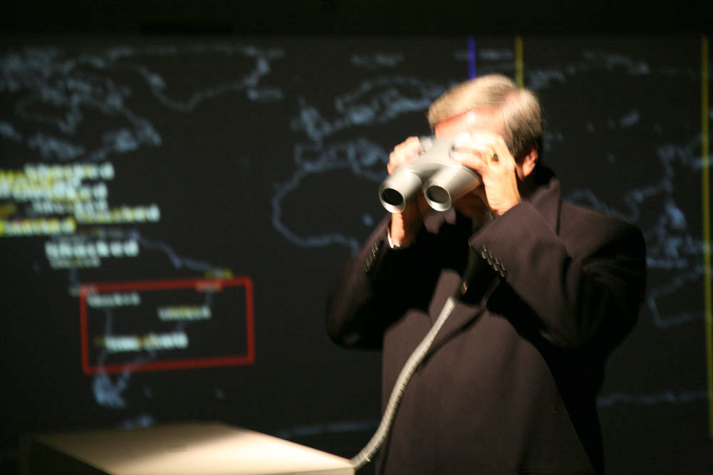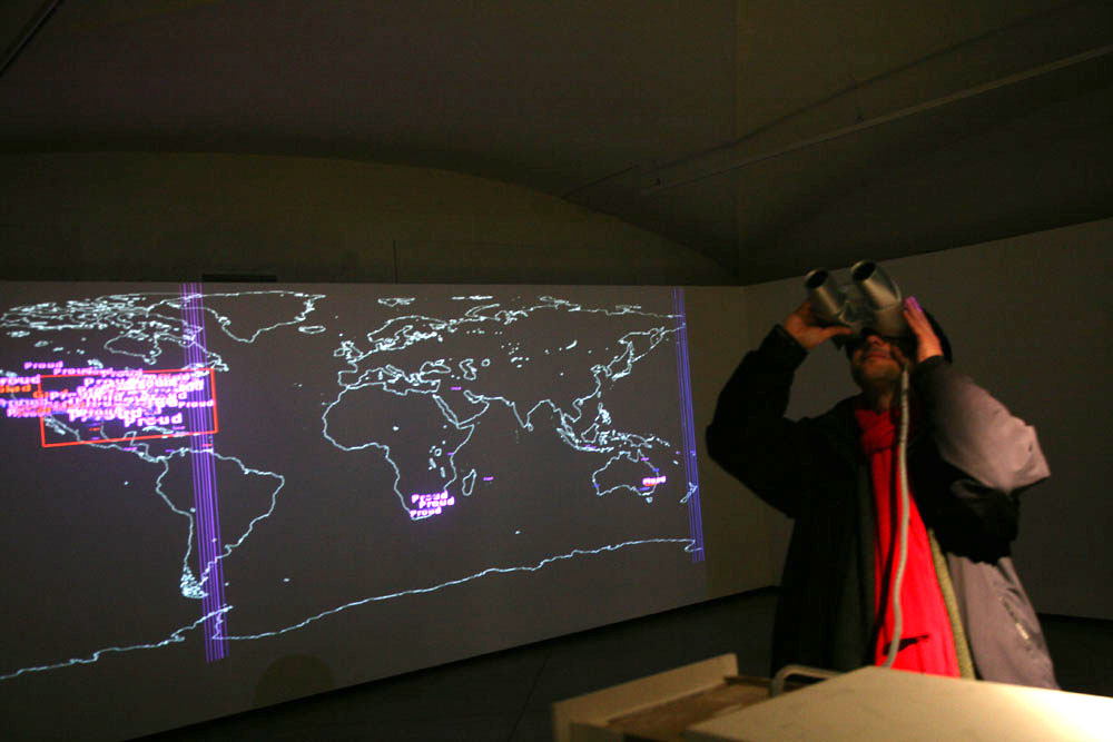 The Installation binoculars, and two screens Screen 1 shows the map of the world, where words are displayed, according to the emotions, that the watchers spot. Screen 2 presents the globe from outside, increasingly covered by the words, and the never-ending list of the emotional rating of the 3200 cities.