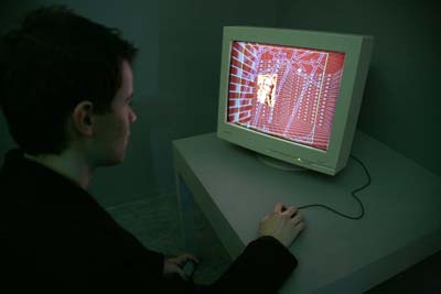 Withdrawn from the world, in a virtually monastic cell, the spectator pursues his obstinate quest of the image of God (of all gods). Facing a small scale screen, he heads forward in a world of bricks. The walls in front of him grow hollow as he moves on. When he decides to change direction, he defines a new corridor. Therefore an architectural space builds up, determined by the visitor’s progression. Each new corridor reveals to him representations of God drawn from the history of art of different cultures. According to the quality of the visitor’s approach, according to the rhythm of his stroll, these utterly plane representations move towards him, grow larger or move away.