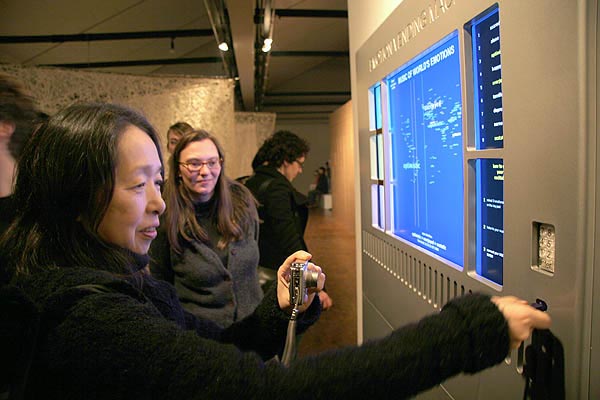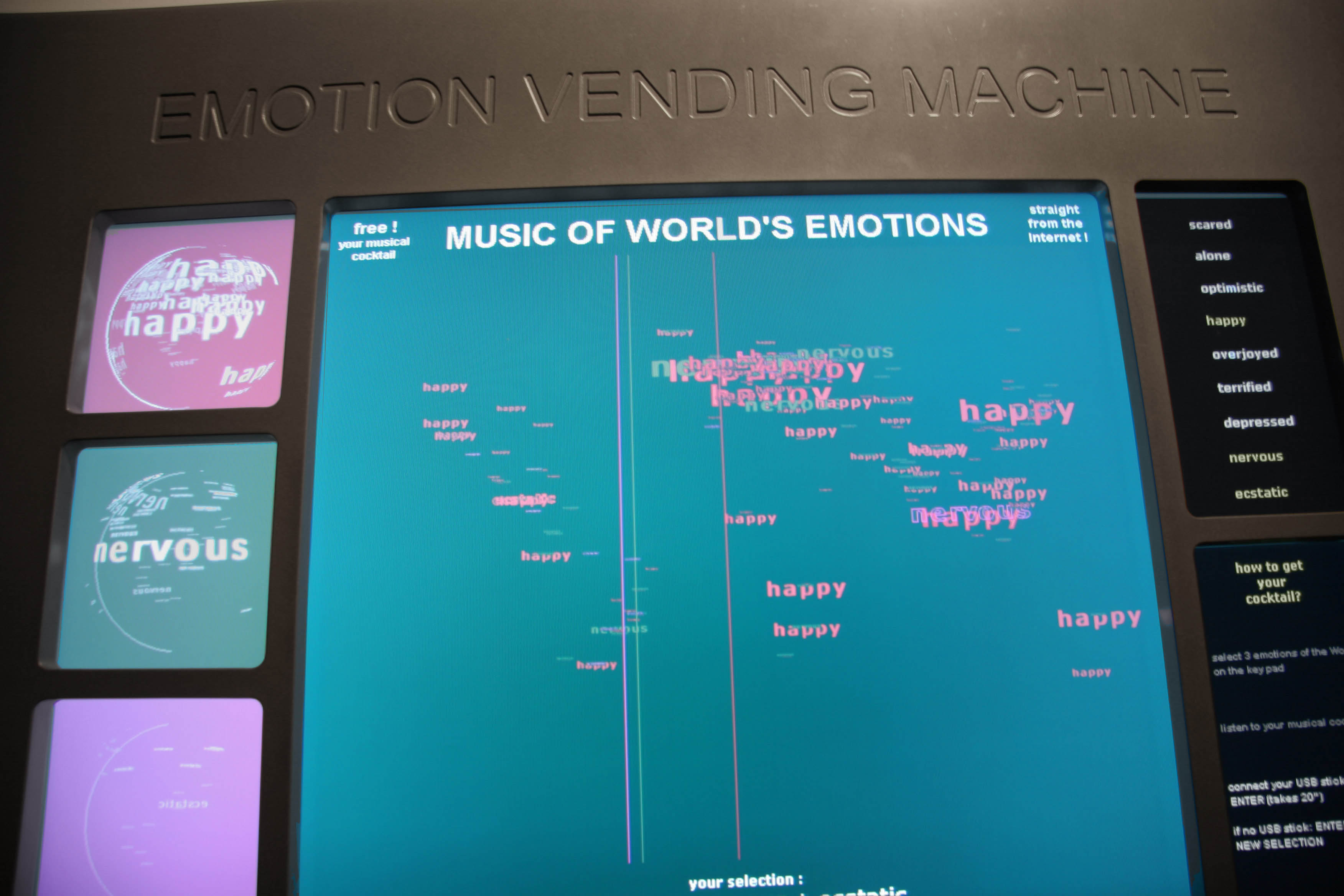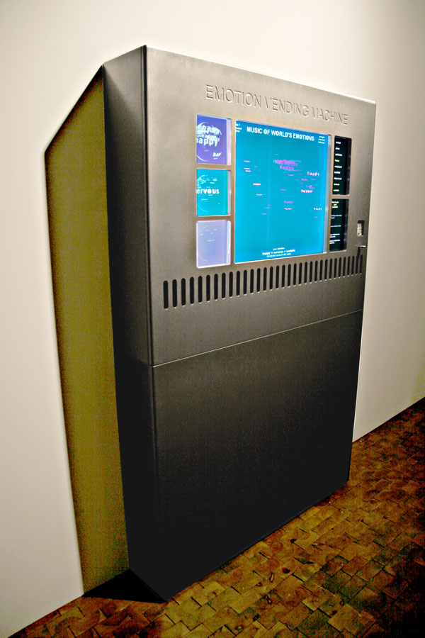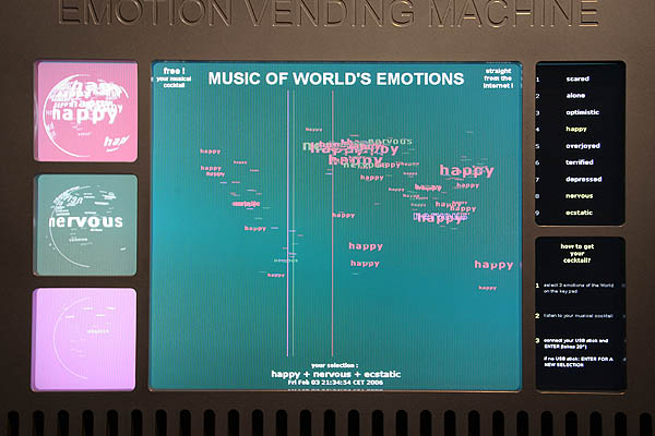 Emotion Vending Machine/Distributeur automatique d'émotions The Emotion Vending Machine is the 12th act of an opus including 15 acts : the Mechanics of Emotions. Exhibitons: Smile Machines curated by Anne-Marie Duguet for Transmediale, Berlin 2006, GIMA Gallery Berlin2006, Espace Paul Ricard, Nemo Festival 2006, exhibition From the Big Questions to The-Dump.net |