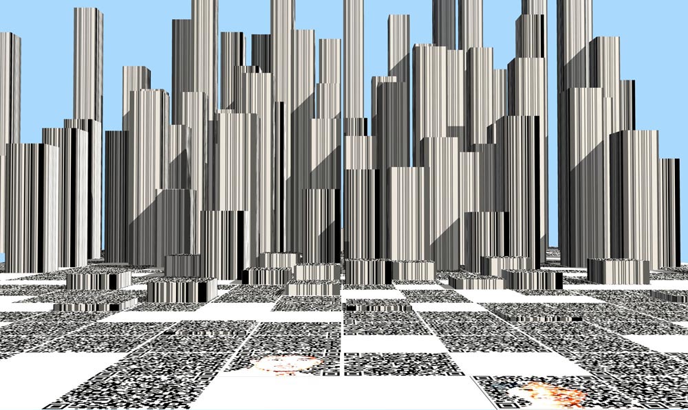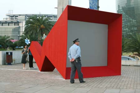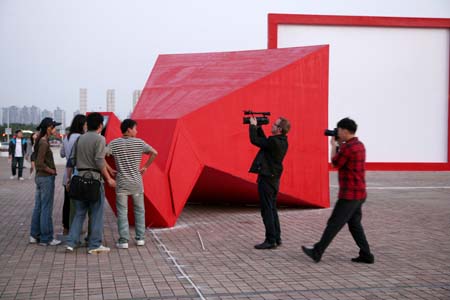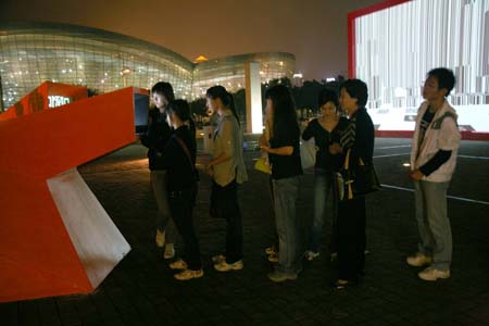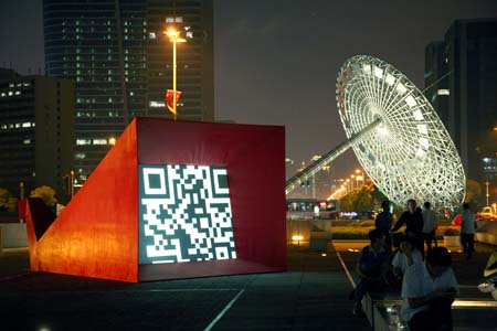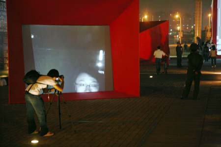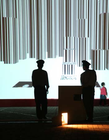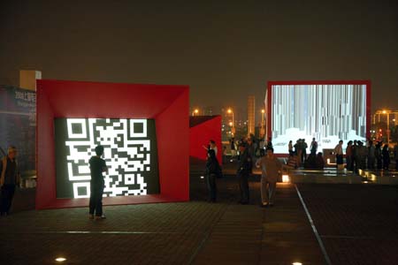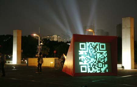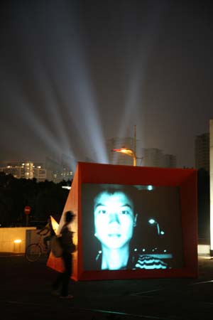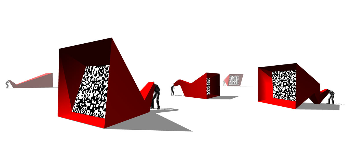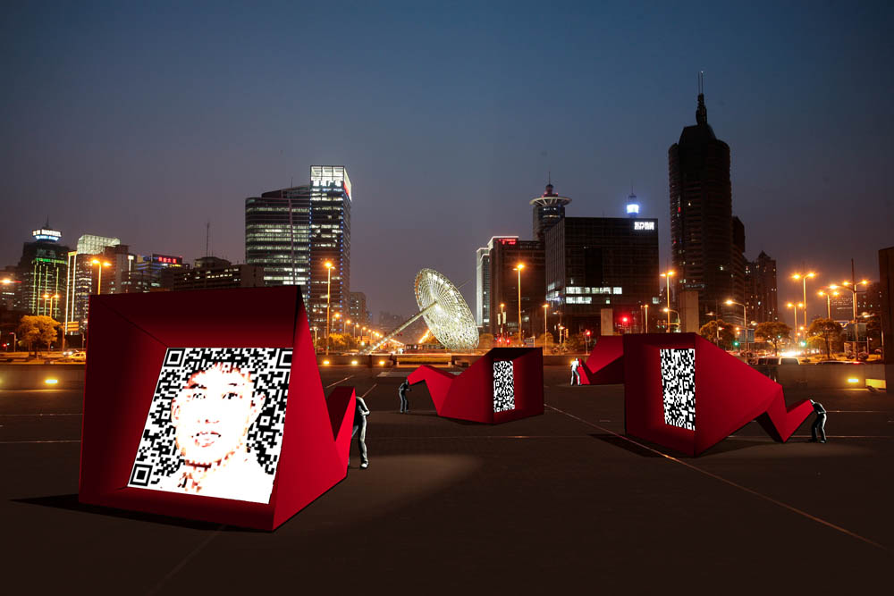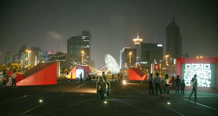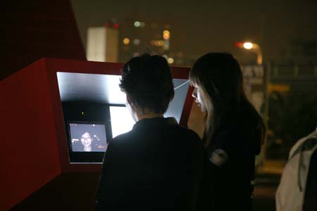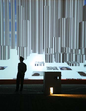 eArts Festival Shanghai NeORIZON is a urban interactive art installation produced for Horizon Outdoor exhibit during eArts Festival Shanghai, October 18-22 2008 curated by Yan Xiaodong. http://www.shearts.org/ NeORIZON The city skyline defines the "profile" of the City. It is the visible part of its identity. At the same time, the skyline alters and replaces the horizon line, the limits of the visible world. The city is hiding the horizon by creating a new one. So “human” like! The city is a place built by the people for the people, at the same time it expands and neutralises their individualities. The process of converting everyone’s energy into a city is not a well-known one. Should people be seen as bricks of this edification? NeORIZON makes this process visible in a symbolic form. The city seems to be invaded by the “IDWorms”. The IDWorms, are crawling on the ground on Century avenue, Pudong, Shanghai. They invite people to have a look inside, then being converted into 2D (QR)Codes which are an apparently neutral way of identifying people and objects. They all look the same if you don’t know how to decipher them. On the main screen a city landscape (IDscape) is being built out of the black and white pixels of the personified IDCodes. On the Internet, everyone can get its own 2D code and use it as a personal signature that everybody will recognise by using cell phones as though they were identifying mass consumption products. In Maurice Benayoun's work, urban installations are the most visible part of what the artist calls Critical Fusion, introducing fiction into reality to improve its transparency. NeORIZON is one of the works that introduce hints to help and decipher codes of our daily lives into the physical space. The IDWorms The IDWorms are odd beings that live in the city, showing off their red shape on Century Avenue. Many of them are crawling in the street. Their shape is a geometric volume with a small end - which makes you feel it looks like a mouth, a mouth swallowing visitors identity - and a large end that is made up of a big rear projection screen. At the small end, at the visitor’s face height, people come to have a look inside. They don’t immediately understand that their face will be converted into a 2Dcode. At the larger end, a screen displaying giant black and white pixels. Sometime a face (the one coming in front of the small end) shows up that is quickly converted into the surface of black and white dots. These worms seem to have a job to do: convert people into signs to make them definitely recognisable. IDCodes There is no entity, objects, animal or people that will escape from tagging. What if we are recognised by an QR Code like any object of consumption? Analysing our image, the IDWorms convert us in Codes that we will be able, after downloading the software on the Internet, to read as the best way to know about the people we meet. The IDscape On one side of the place on Century Avenue, Pudong, Shanghai, where the IDWorms crawl, a giant screen, visible from the same angle displays a kind of city landscape that perpetually grows. At the bottom of the screen, the ground moves away like a long surface of fabric mapped with thousands of ID Codes (2D codes built out of the visitors’ face) representing people captured by the IDWorms. The visitors IDcodes have been converted into the very texture of the city. The one the city will be made of. As the IDcodes are moving away from us like a continuously growing roll of fabric, some of them are extruded from the ground, becoming cubes and volumes, converting the ground surface into a growing number of buildings. People are converted into a city that will never end growing. Either a sculpture or a processing machine, the IDWorms are doing this very specific filtering that makes an artwork become an enlightening experience talking to the people about people. The resulting image must give the impression that IDCodes are becoming the skyline of an ever-growing city, hiding the horizon.