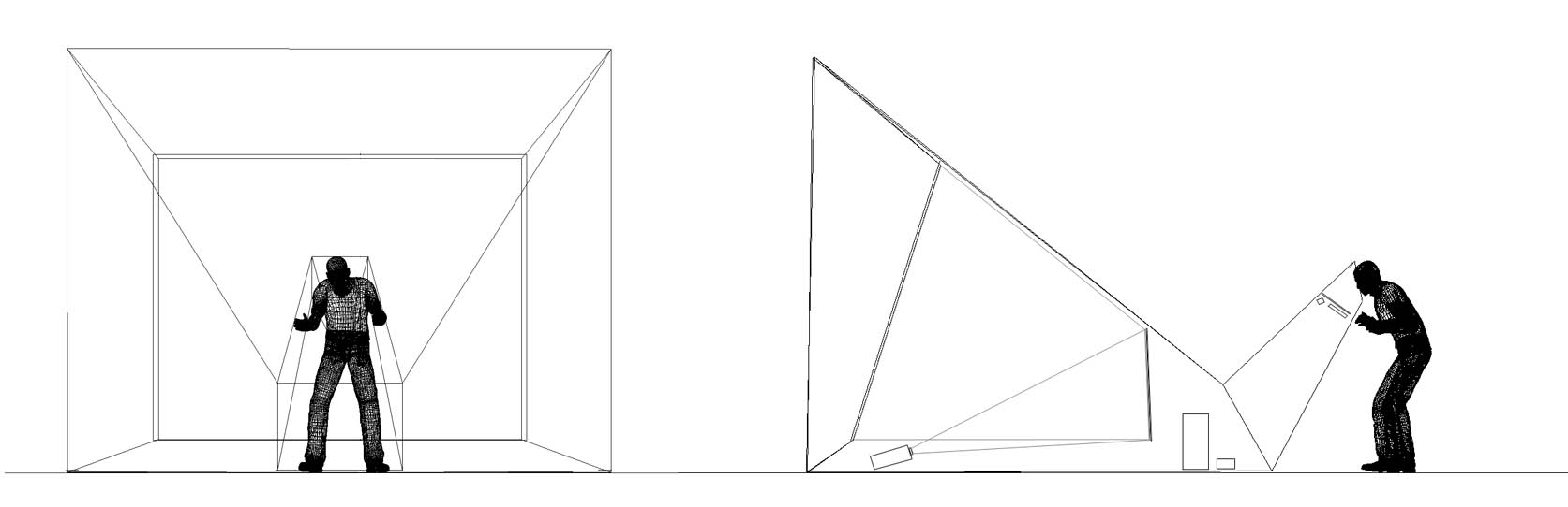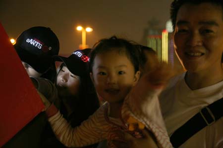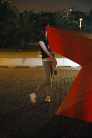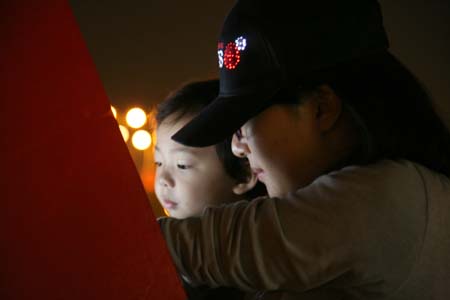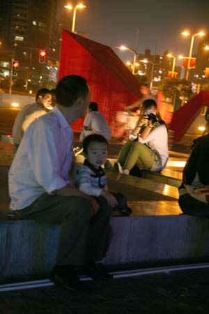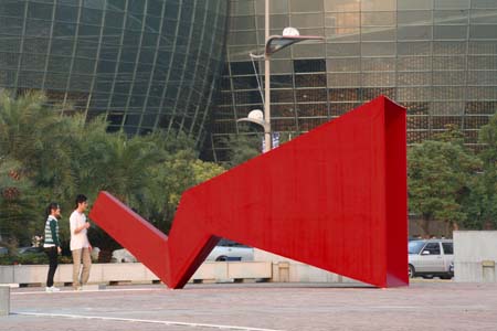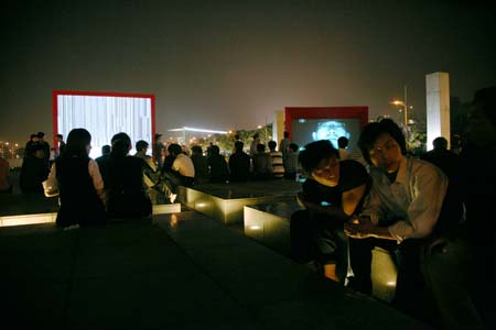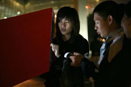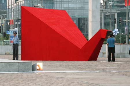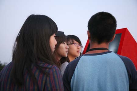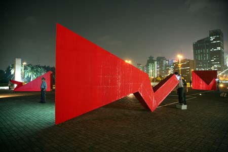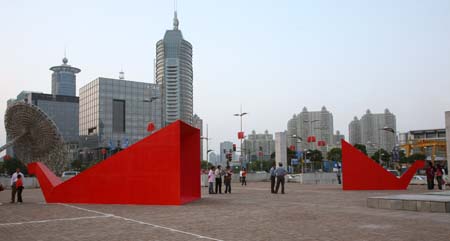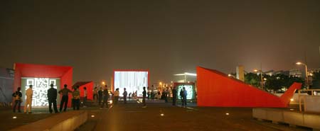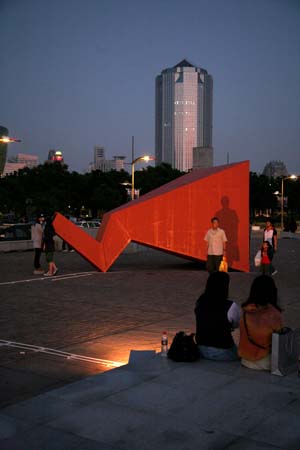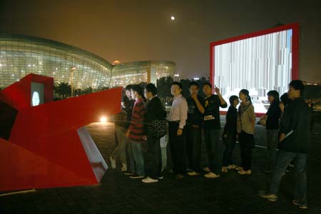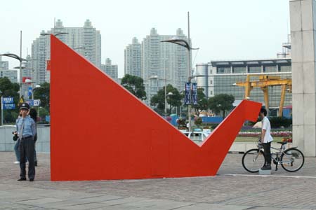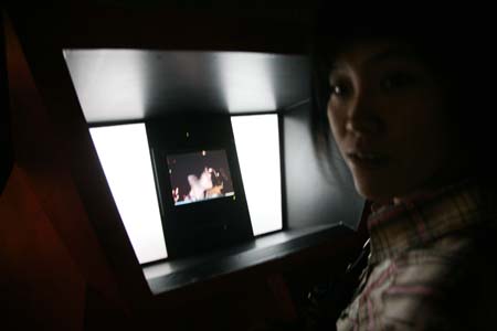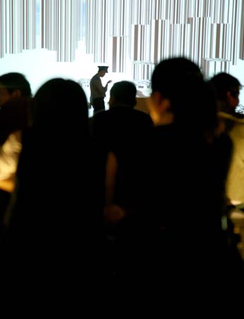 eArts Festival Shanghai NeORIZON is a urban interactive art installation produced for Horizon Outdoor exhibit during eArts Festival Shanghai, October 18-22 2008 curated by Yan Xiaodong. http://www.shearts.org/ NeORIZON The city skyline defines the "profile" of the City. It is the visible part of its identity. At the same time, the skyline alters and replaces the horizon line, the limits of the visible world. The city is hiding the horizon by creating a new one. So “human” like! The city is a place built by the people for the people, at the same time it expands and neutralises their individualities. The process of converting everyone’s energy into a city is not a well-known one. Should people be seen as bricks of this edification? NeORIZON makes this process visible in a symbolic form. The city seems to be invaded by the “IDWorms”. The IDWorms, are crawling on the ground on Century avenue, Pudong, Shanghai. They invite people to have a look inside, then being converted into 2D (QR)Codes which are an apparently neutral way of identifying people and objects. They all look the same if you don’t know how to decipher them. On the main screen a city landscape (IDscape) is being built out of the black and white pixels of the personified IDCodes. On the Internet, everyone can get its own 2D code and use it as a personal signature that everybody will recognise by using cell phones as though they were identifying mass consumption products. In Maurice Benayoun's work, urban installations are the most visible part of what the artist calls Critical Fusion, introducing fiction into reality to improve its transparency. NeORIZON is one of the works that introduce hints to help and decipher codes of our daily lives into the physical space. The IDWorms The IDWorms are odd beings that live in the city, showing off their red shape on Century Avenue. Many of them are crawling in the street. Their shape is a geometric volume with a small end - which makes you feel it looks like a mouth, a mouth swallowing visitors identity - and a large end that is made up of a big rear projection screen. At the small end, at the visitor’s face height, people come to have a look inside. They don’t immediately understand that their face will be converted into a 2Dcode. At the larger end, a screen displaying giant black and white pixels. Sometime a face (the one coming in front of the small end) shows up that is quickly converted into the surface of black and white dots. These worms seem to have a job to do: convert people into signs to make them definitely recognisable. IDCodes There is no entity, objects, animal or people that will escape from tagging. What if we are recognised by an QR Code like any object of consumption? Analysing our image, the IDWorms convert us in Codes that we will be able, after downloading the software on the Internet, to read as the best way to know about the people we meet. The IDscape On one side of the place on Century Avenue, Pudong, Shanghai, where the IDWorms crawl, a giant screen, visible from the same angle displays a kind of city landscape that perpetually grows. At the bottom of the screen, the ground moves away like a long surface of fabric mapped with thousands of ID Codes (2D codes built out of the visitors’ face) representing people captured by the IDWorms. The visitors IDcodes have been converted into the very texture of the city. The one the city will be made of. As the IDcodes are moving away from us like a continuously growing roll of fabric, some of them are extruded from the ground, becoming cubes and volumes, converting the ground surface into a growing number of buildings. People are converted into a city that will never end growing. Either a sculpture or a processing machine, the IDWorms are doing this very specific filtering that makes an artwork become an enlightening experience talking to the people about people. The resulting image must give the impression that IDCodes are becoming the skyline of an ever-growing city, hiding the horizon.