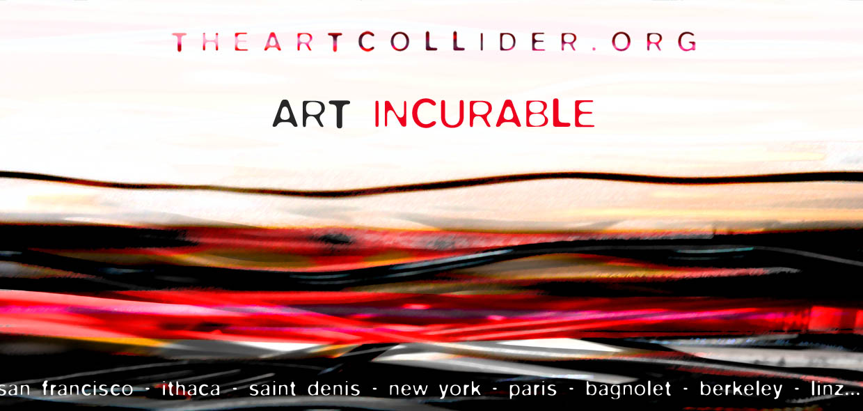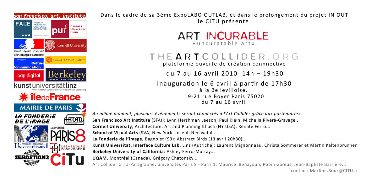 a first synchronized event to demonstrate participation in the Collider, connecting works produced online and presenting an exhibition with different partners: San Francisco, New York, Ithaca, Paris, Bagnolet, Linz, … The Art Collider: “Uncuratable ART“ from 7 to 16 April 2010 2pm - 7:30pm In 2006, CiTu launched its network to connected creation: In-Out, with a series of exhibitions, Outlab, In-Out X.0, several workshops and numerous creations. Today, In-Out evolved into The Art Collider, an open online network. It has been considerably improved with updated infrastructure and new authoring tools. The Art Collider is both a tool and a unique creative space. The network has no boundaries and the scope only minimal constraints. With the participation of artists and reputable organizations the Art Collider has reached international dimension: The link developed with the “Sebastian 2” project allowed to establish a close collaborations between the CiTu and the San Francisco Art Institute, giving The Art Collider a truly international scope and and resulted in reaching the critical mass. Kunstuniversität Linz, School of Visual Arts New York, Cornell University Ithaca NY and UQAM Montréal have join the project since. From April 7 to 16 a number of events connected via The Art Collider will take place around the world in collaboration with the partners and the artists involvement