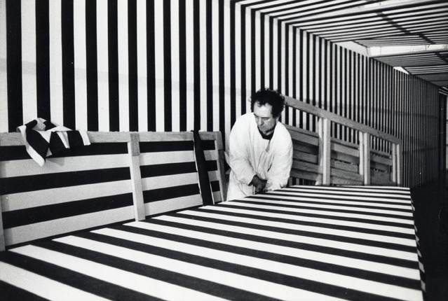 A l’image du « Corridoscope » de Buren, où alternent des bandes noires et blanches, le montage exploite une succession régulière de plans très courts. 935 mètres de bande adopte un tempo saccadé qui suit à la lettre celui de la bande son,texte et musique de l’exposition. Dans sa vidéo M. Benayoun réalise une osmose entre l’image qu’il propose et le travail de Buren. [L.D.] source: Catalogue : «2e manifestation international de vidéo Montbéliard – France 13-18 mars 1984.» |