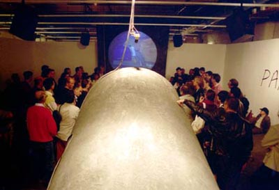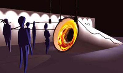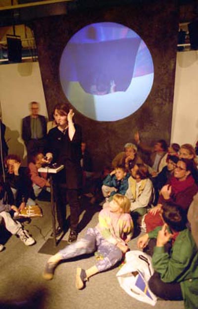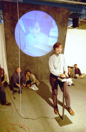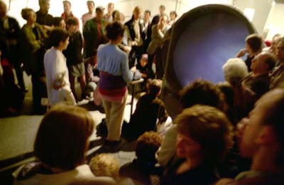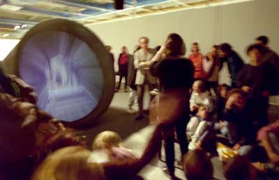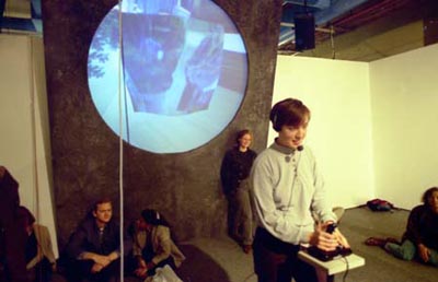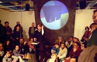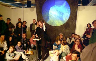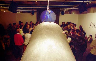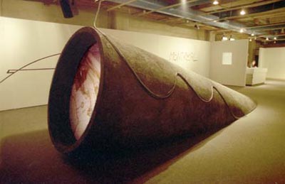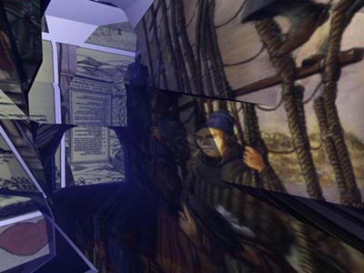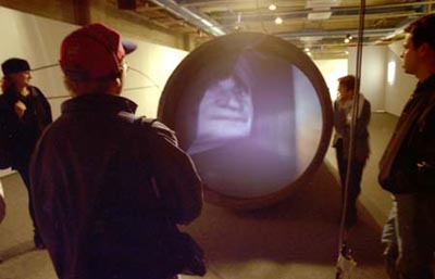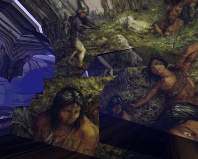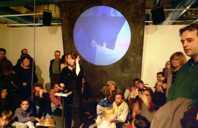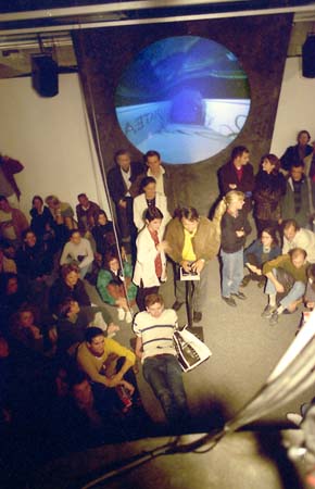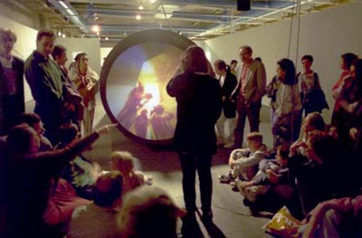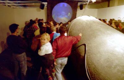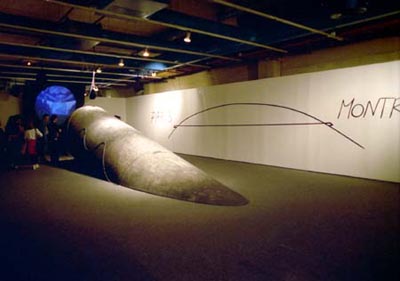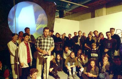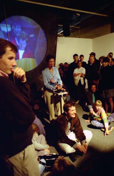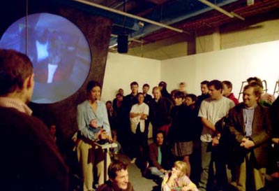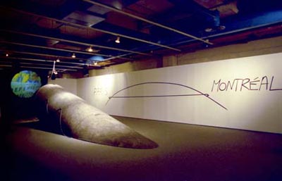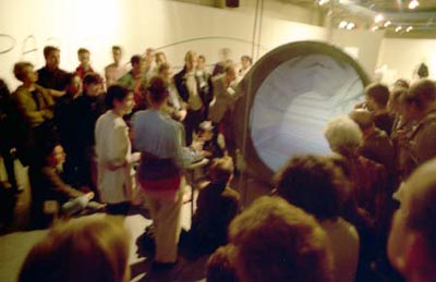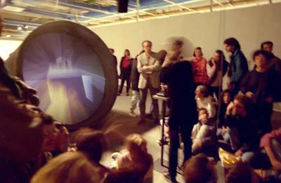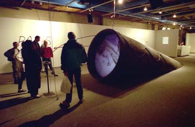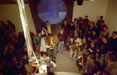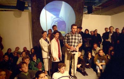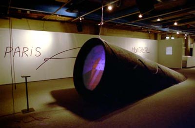 Musical creation by Martin Matalon linking the Pompidou center (Paris) and the Museum of Contemporary Art of Montréal - September 19 - 24, 1995 images of the Tunnel and the 'diggers' in Montreal and Paris, snapshots of the virtual tunnel , video QuickTime (58 Mo) download full presentation documents and press clipping December 1995. The Tunnel Under the Atlantic, televirtual art installation, established a link between Montreal and Paris, two towns physically distant by thousands of miles. The Tunnel enabled hundreds of people from both sides to meet. From each side, a two-meter-diameter tube, made us think of a linear crossing of our planet, as if it were dug under the ground, shouting up in the middle of the Contemporary Art Museum in Montreal on one side, and in the lower floor of the Pompidou Centre in Paris. The route that lies between the two spots is no simulation of the ocean underground, it is a block of symbolic matter in which the geological strata leave the place to iconographic strata. They are layers of pictures taken in the history of the two cultures that everybody can reveal each time they dig. The collective exploration uncovers fragments of rare or familiar pictures, which are as may opportunities to wake up the collective memory of the participants. Helping us to loitering and talking to people, these remains transform everybody's digging route into a unique experience, into a personal assemblage made up of sounds and pictures amidst a three dimensional space architectured through their moves. While digging, the visitors can talk with their partners across the Atlantic Ocean. The sounds of their voices are anchored in space and they enable everyone to find out the directions where to meet the other. I takes six days to built and pave the symbolic space before the de visu meeting of the two-continent diggers. Free from the physics constraints, Space then is a function of Time. There, speed is not the best way to speed up the meeting, but a way of specifying everyone's position within information. The Tunnel architecture created by each visitor determines the editing of the picture in the time of their moves and in the built space. Altered and shaped by the newly dug tunnel, the revealed images conjure up the very matter of scenery that redefines itself as the aftermath of each explorer's/visitor's decision. Their sequencing in Time and assemblage in Space are neither merely elements of predetermination nor elements of randomisation. Through the things they deal with, and through the selected images, both come from each visitors own way of digging, If we cannot master what we are going to discover, what we find out depends on our own way of doing things. If we let ourselves enjoy the tantalising immediate feeling of euphorical capacity of digging at high speed, we do not come across the same iconographic remains as the ones we can see when explore the discovered elements carefully and curiously. Everybody's interest in some details in the documents accounts for the theme and the semantic developments that will come afterwards. The writing process then does not concerns a definitely established building up of sounds and pictures any longer, but does concern the creation of their appearance conditions thanks to the visitors exploratory behaviour. The combination of chance and determination which defines the result architecture, makes the world-to-explore similar to our current experience of life. The "Gadevu", the agent developed in a basic version for the Tunnel under the Atlantic has become the Z-A Profiler we can use for the dynamic and intuitive exploration of complex databases. Combining the spontaneous actions and dialogues, the music composed by Martin Matalon alters in the course of event and is organised around personal routes, as it is the case with the pictures then revealed. The televirtual event -i.e. a remote connection of people in an interactive symbolic space- is filmed with four virtual cameras. What they get is automatically mixed and edited and that takes into account each participant speech. They can discover, in the event of a counter-shot, their own live pictures floating within the space they have just dug up. They will not be able to see each other before the two sides of the tunnel meet. The exchange, essentially made up of sounds so far, then becomes visual. When the meeting is achieved, other persons can at last take the same way or create new ones as if they were in a collective quest of a shared memory. maurice benayoun 1995-2003 the Tunnel under the Atlantic Directed by : Maurice Benayoun Computer development : David Nahon & Tristan Lorach (Z-A Production) Produced by : Stéphane Singier (Z.A Production) Stage Manager : Michèle Ange Coumau (Z.A Production) Press relations : Karen Benarrouch (Z.A Production) Musical creation : Martin Matalon Musical assistants : Xavier Chabot, Frédéric Voisin & Xavier Bordelais (IRCAM) PRODUCTION : France : Z.A production Paris France E-mail : maurice benayoun Canada : Zone production Montreal Canada the Tunnel under the Atlantic is : A Délégation aux Arts Plastiques, Ministère de la Culture public order (France). Coproduction : Z.A Production / IRCAM / Mission Recherche et Technologies du Ministère de la Culture / Centre Georges Pompidou. Thanks to Ministère canadien du Patrimoine - Musée Canadien des Civilisations de Hull - Réunion des Musées Nationaux - Silicon Graphics France et Europe (SGI) - Canon France. An ISEA 95, Montreal common project. WEB adresses : IRCAM - Ministère de la culture |