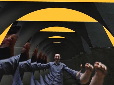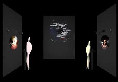 note of intention Far Near is a new example of 'communication scenography', unlike the Virtual Tunnels/ Tunnel under the Atlantic, or the Paris-New Delhi Tunnel -which linked "diggers" thousands miles away; FAR NEAR (e-motion) works as a local and worldwide network. This work recreates the technological distance between two people in the same space. However, the simplest things become complex...For example, it is difficult for each digger to remain in contact with the other. The communication-link between is influenced and varies according to feelings and sensations emanating from all over the planet. The network is a semblance of the global body, it functions as a huge nervous system, making the diggers sensitive and aware of the pain of humanity and it's possible effects. During the exchange, each digger experiences a loss visually or otherwise of the other person, the remaining signal is the result of the ravishes of violence, excess communication and economical factors. The pain is dull, however, it affects only the exchange, not the physical body. The installation will consist of a room with three, independent, screens/walls. On both opposing walls, two rear projections (up to 2m diameter) allow the "digging" simulation to occur and represent the two ends of a tunnel linking two people. The two visitors are placed back to back. As each 'digs' he/she cuts circular holes into a video image that has become an infinite collection of flat stills - generated at video speed i.e. 25/fps. The digging takes place until he/she discovers image of the other.