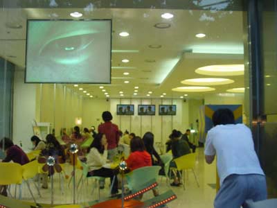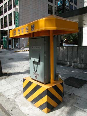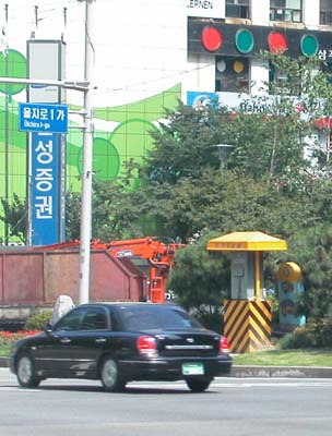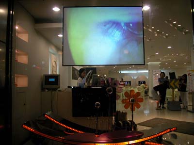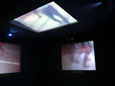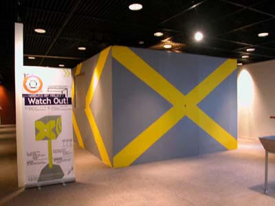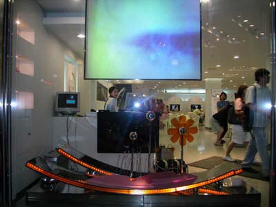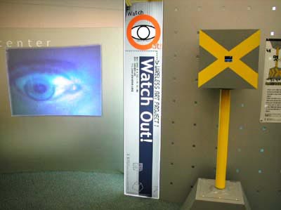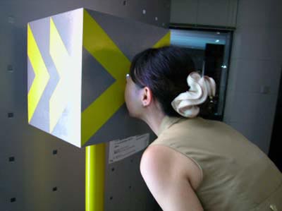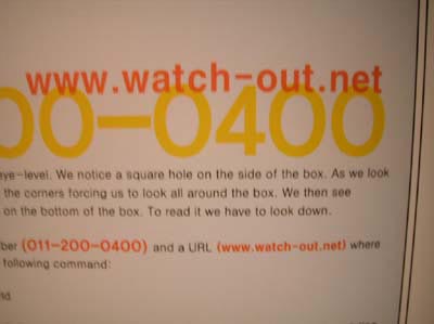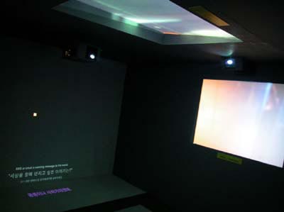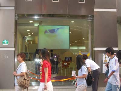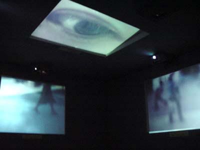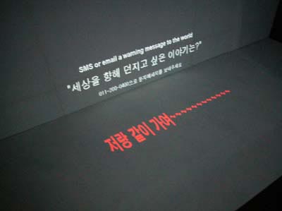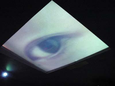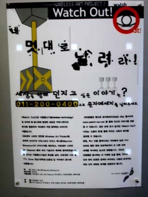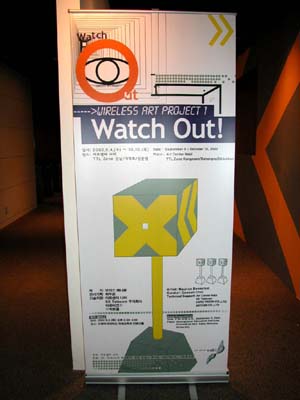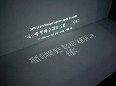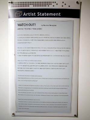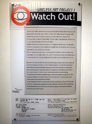 The World wide Panoptikon increases global exposure. Is Big Watcher b[r]othering us? Should we be afraid of being seen or should we enjoy the World's transparency as a way of proclaiming In Watch Out! eyes are coming from everywhere to see us. Their scale on the screen gives them another meaning. These eyes no longer belong to the pedestrian spectators watching inside a box but instead resemble those of digital gods checking out the World. They are coming to look down on us, as if somebody finally dares to know what's going on inside Plato's cave. The mobility of the wireless boxes, like individuals, introduces a friendly, human-sized way of connecting people. Watch Out! confronts the World we see and think. The project centres on a whole-scale inversion of the traditional dynamics of seeing and thinking: the watcher is seen while the object (the public) cannot be seen; the thinker is read in the sense that the watcher's expression changes according to the responses submitted via SMS and email. The object of watcher's gaze shifts from the written text to the public. maurice benayoun 2002 exhibition : Art Center Nabi, Seoul, september 2002 |