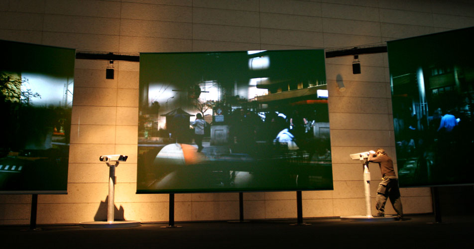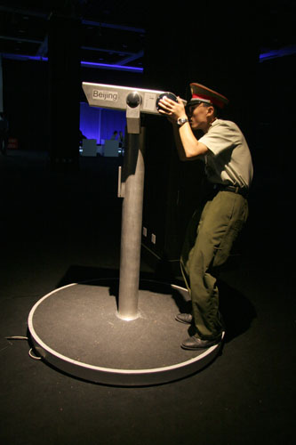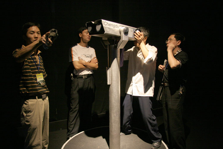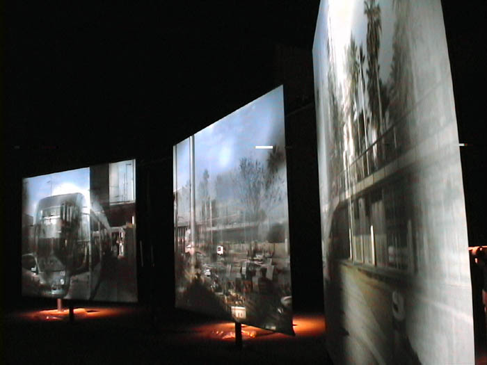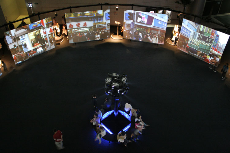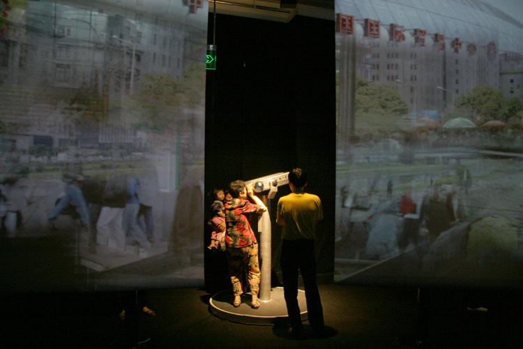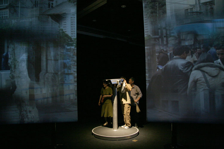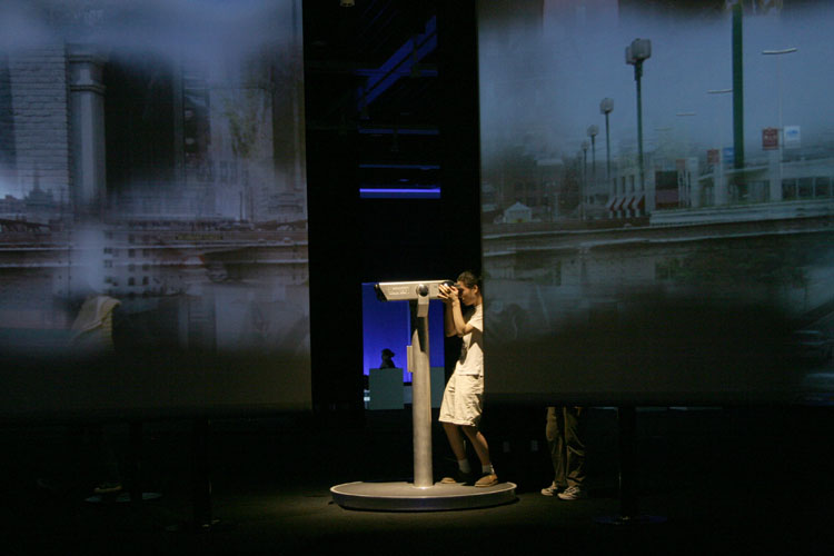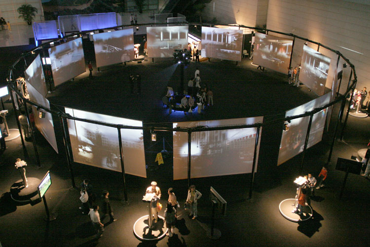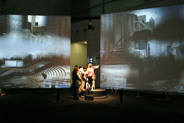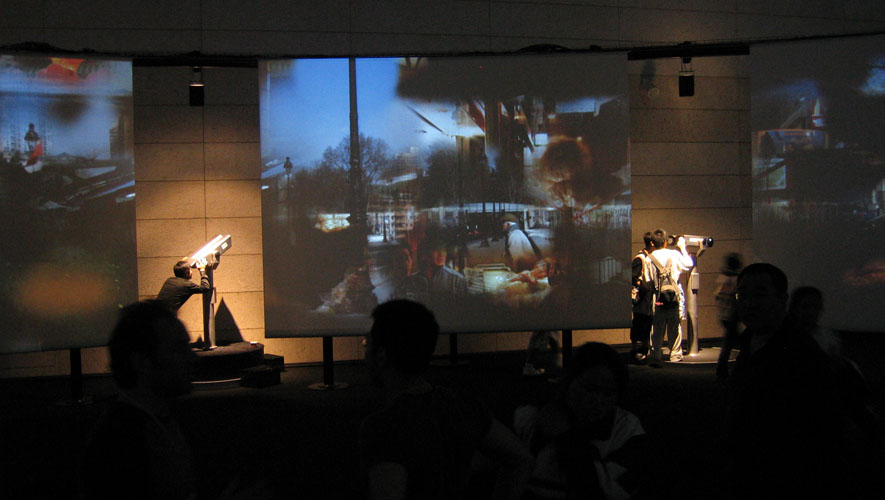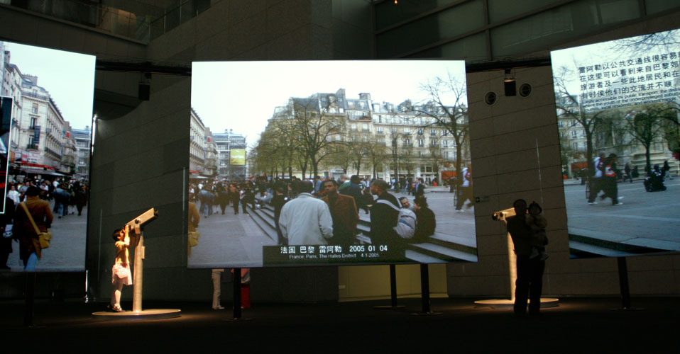 Cosmopolis by Maurice Benayoun from Le Pixel Blanc on Vimeo. video making of, Villacoublay, France (VF) COSMOPOLIS Overwriting the City An interactive artistic and scientific multimedia exhibition on the major issues linked to the world urbanisation Cosmopolis endeavours to examine urban realities through people's eyes. It is an artistic, and scientific interpretation of urbanization, making a visit a physical and intellectual experience. The visitor enters a big, moving panorama of a constantly changing city. Twelve observation binoculars, much like those found at scenic lookout points, allow one to be surrounded 360° by twelve urban environments. Seven Occidental cities and five Asian cities: Paris , Berlin , Barcelona , Chicago , Johannesburg , Cairo , Sao Paulo , Beijing , Shanghai , Chongqing , Chengdu , Hong Kong , can thus be discovered, each from different viewpoints. Bearing no resemblance to the touristy landscapes one may expect to see, these scenes lay out major urban issues simply through a choice of viewpoint: transportation, environment, architecture, energy, health... Only later does the visitor realize that his or her viewpoint through the VR binocular is “captured” and used to create the big panorama of Cosmopolis –the permanently mutating World City- at the centre of the exhibition. Little by little, a surprising city is built, both strange and familiar, the fruit of visitors' intersecting gazes and visual experiences. The visitors seated in the centre of the exhibition witness this action, which is both artistically stunning and symbolically crucial: the City of Tomorrow must be the fruit of intersecting gazes and experiences. At regular intervals, the big panorama is replaced by one of the urban landscapes, depicted via a scanning action that sweeps the entire circumference of the central space. It displays key areas in the form of words, sounds, and video images. In various spots, it points out the limitations of a urbanistic course or the solutions found that can be adopted elsewhere. Cosmopolis is therefore a space for exchange and analysis, contemplation and action. It presages new ways of confronting major urban tendencies and makes Asian and Western viewpoints converge in a symbolic and interrogating way. Exhibition places