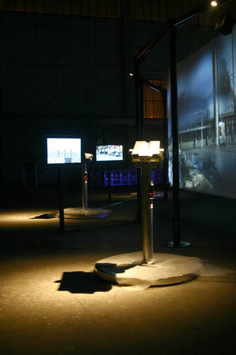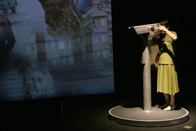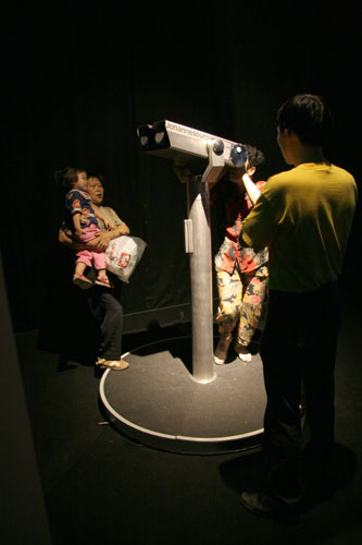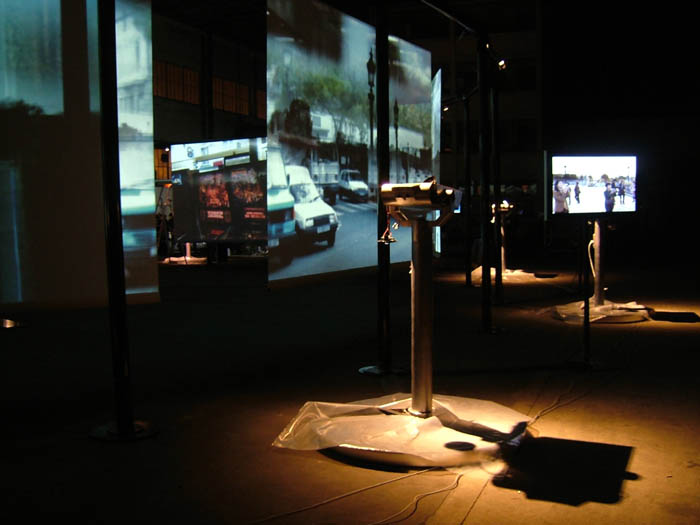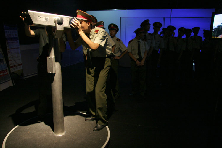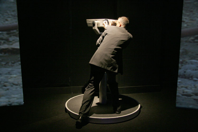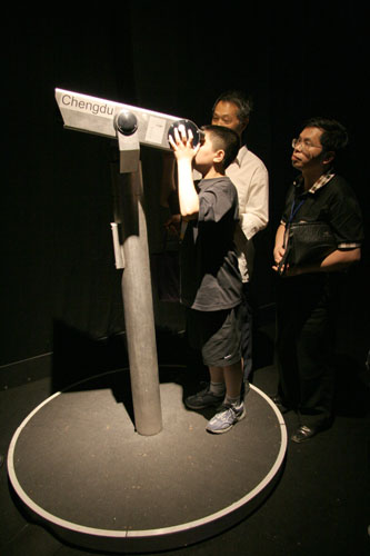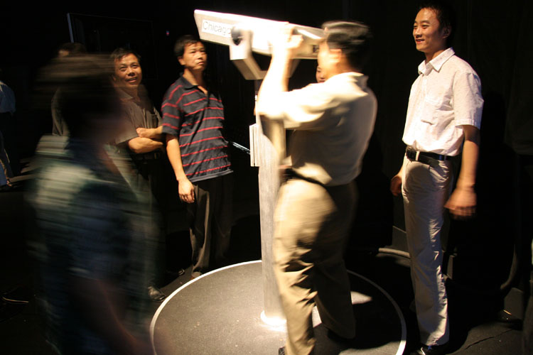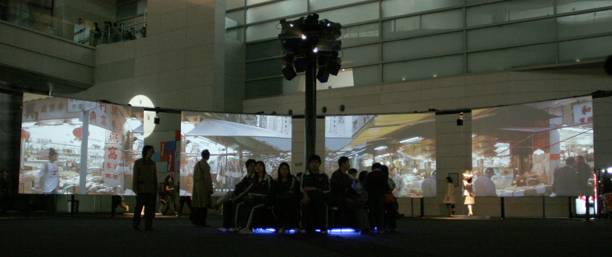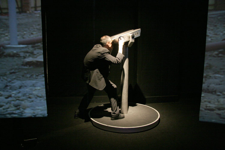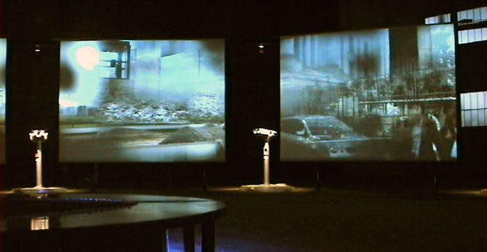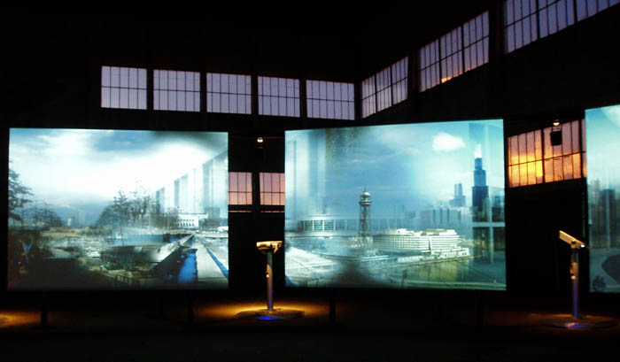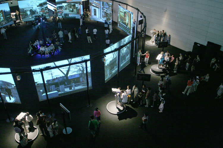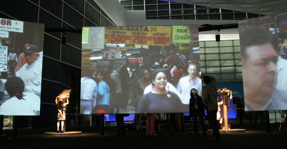 Cosmopolis by Maurice Benayoun from Le Pixel Blanc on Vimeo. video making of, Villacoublay, France (VF) COSMOPOLIS Overwriting the City An interactive artistic and scientific multimedia exhibition on the major issues linked to the world urbanisation Cosmopolis endeavours to examine urban realities through people's eyes. It is an artistic, and scientific interpretation of urbanization, making a visit a physical and intellectual experience. The visitor enters a big, moving panorama of a constantly changing city. Twelve observation binoculars, much like those found at scenic lookout points, allow one to be surrounded 360° by twelve urban environments. Seven Occidental cities and five Asian cities: Paris , Berlin , Barcelona , Chicago , Johannesburg , Cairo , Sao Paulo , Beijing , Shanghai , Chongqing , Chengdu , Hong Kong , can thus be discovered, each from different viewpoints. Bearing no resemblance to the touristy landscapes one may expect to see, these scenes lay out major urban issues simply through a choice of viewpoint: transportation, environment, architecture, energy, health... Only later does the visitor realize that his or her viewpoint through the VR binocular is “captured” and used to create the big panorama of Cosmopolis –the permanently mutating World City- at the centre of the exhibition. Little by little, a surprising city is built, both strange and familiar, the fruit of visitors' intersecting gazes and visual experiences. The visitors seated in the centre of the exhibition witness this action, which is both artistically stunning and symbolically crucial: the City of Tomorrow must be the fruit of intersecting gazes and experiences. At regular intervals, the big panorama is replaced by one of the urban landscapes, depicted via a scanning action that sweeps the entire circumference of the central space. It displays key areas in the form of words, sounds, and video images. In various spots, it points out the limitations of a urbanistic course or the solutions found that can be adopted elsewhere. Cosmopolis is therefore a space for exchange and analysis, contemplation and action. It presages new ways of confronting major urban tendencies and makes Asian and Western viewpoints converge in a symbolic and interrogating way. Exhibition places