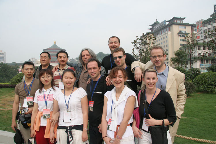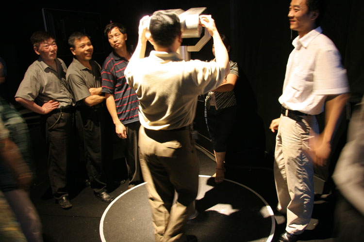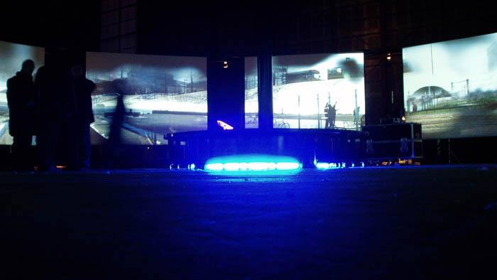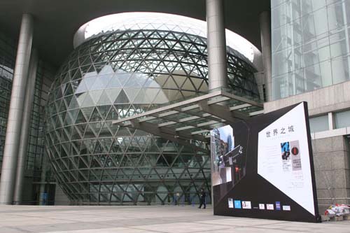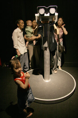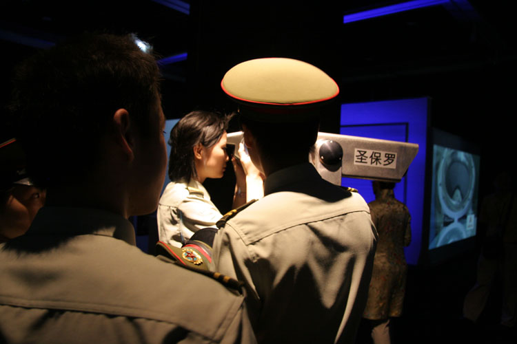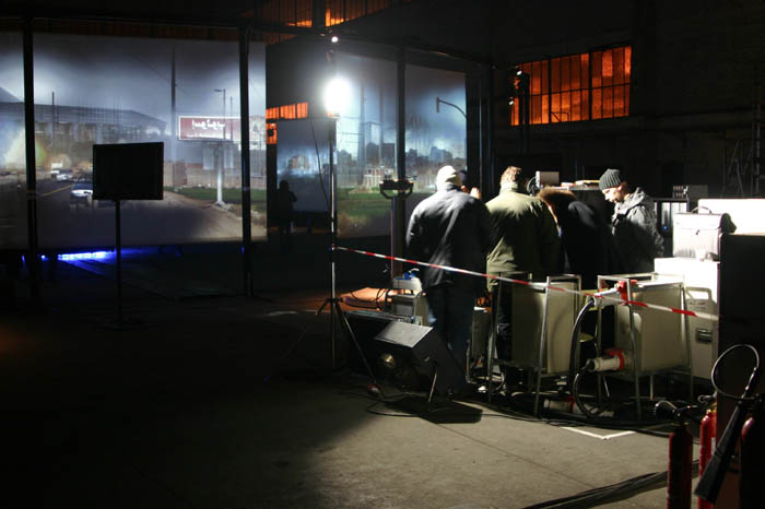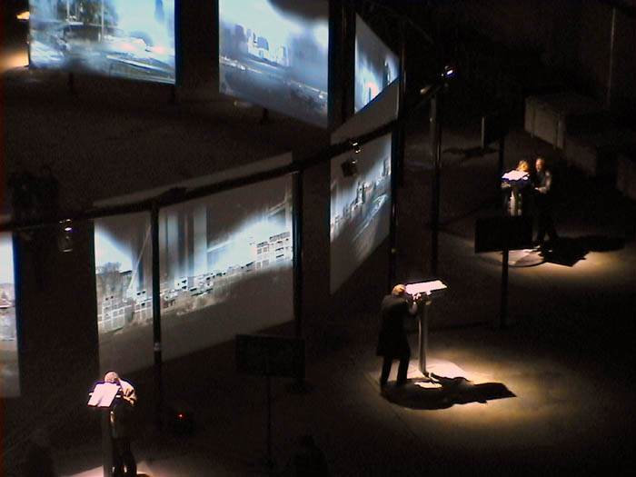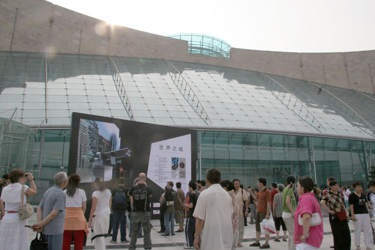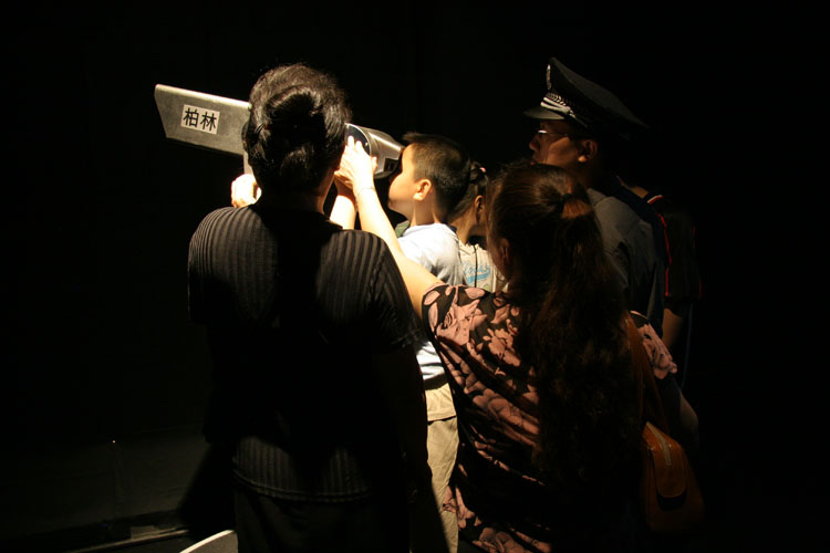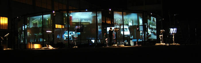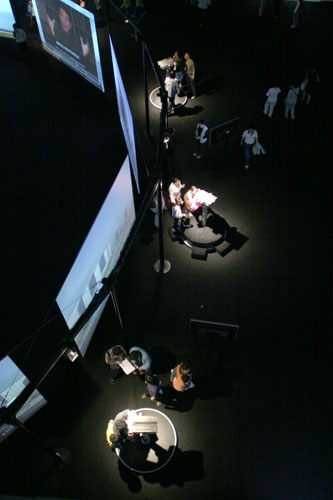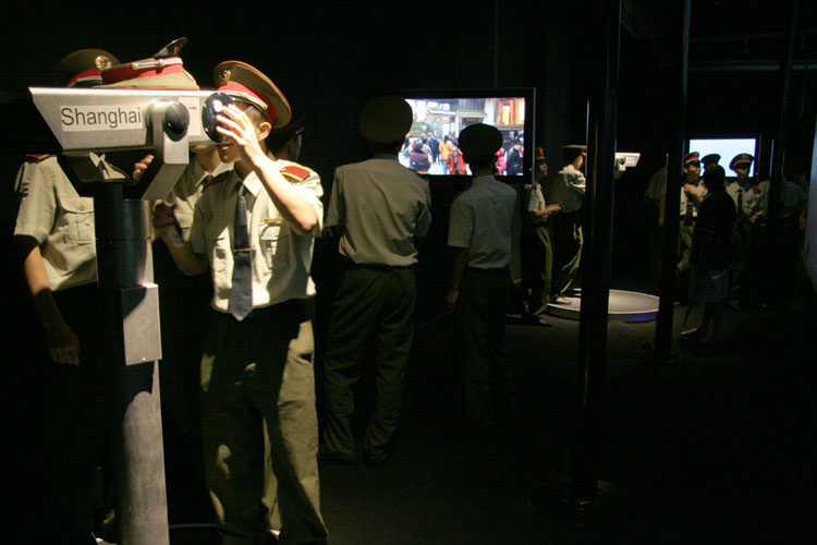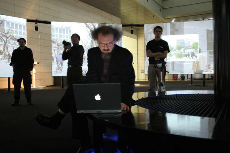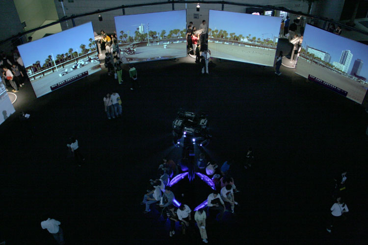 Cosmopolis by Maurice Benayoun from Le Pixel Blanc on Vimeo. video making of, Villacoublay, France (VF) COSMOPOLIS Overwriting the City An interactive artistic and scientific multimedia exhibition on the major issues linked to the world urbanisation Cosmopolis endeavours to examine urban realities through people's eyes. It is an artistic, and scientific interpretation of urbanization, making a visit a physical and intellectual experience. The visitor enters a big, moving panorama of a constantly changing city. Twelve observation binoculars, much like those found at scenic lookout points, allow one to be surrounded 360° by twelve urban environments. Seven Occidental cities and five Asian cities: Paris , Berlin , Barcelona , Chicago , Johannesburg , Cairo , Sao Paulo , Beijing , Shanghai , Chongqing , Chengdu , Hong Kong , can thus be discovered, each from different viewpoints. Bearing no resemblance to the touristy landscapes one may expect to see, these scenes lay out major urban issues simply through a choice of viewpoint: transportation, environment, architecture, energy, health... Only later does the visitor realize that his or her viewpoint through the VR binocular is “captured” and used to create the big panorama of Cosmopolis –the permanently mutating World City- at the centre of the exhibition. Little by little, a surprising city is built, both strange and familiar, the fruit of visitors' intersecting gazes and visual experiences. The visitors seated in the centre of the exhibition witness this action, which is both artistically stunning and symbolically crucial: the City of Tomorrow must be the fruit of intersecting gazes and experiences. At regular intervals, the big panorama is replaced by one of the urban landscapes, depicted via a scanning action that sweeps the entire circumference of the central space. It displays key areas in the form of words, sounds, and video images. In various spots, it points out the limitations of a urbanistic course or the solutions found that can be adopted elsewhere. Cosmopolis is therefore a space for exchange and analysis, contemplation and action. It presages new ways of confronting major urban tendencies and makes Asian and Western viewpoints converge in a symbolic and interrogating way. Exhibition places