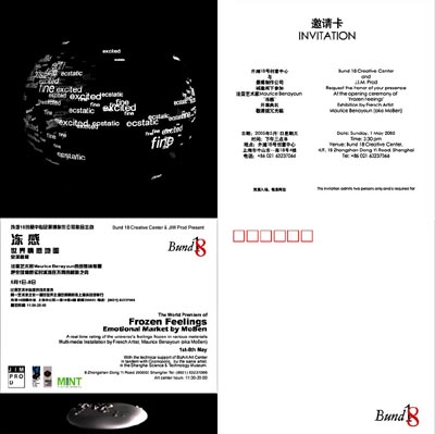 Like for the stock exchange, 3200 quotations for an emotion coresponding at 3200 cities all over the world are displayed in real time. here, in Shanghai : insecure, ecstatic, alone... |