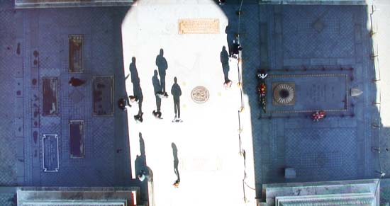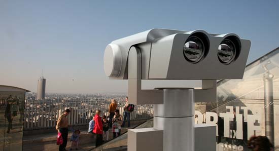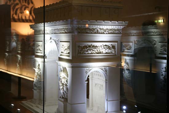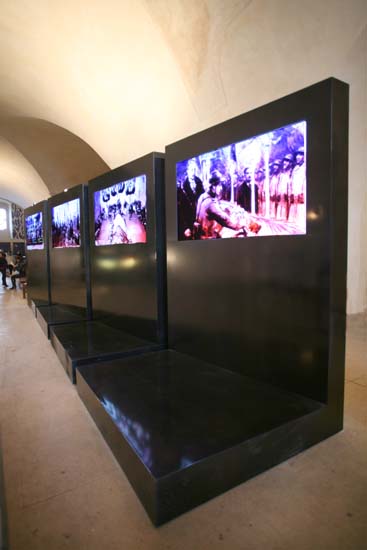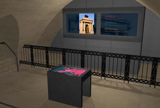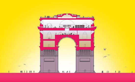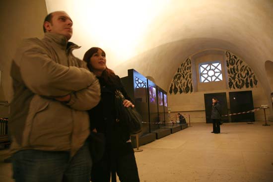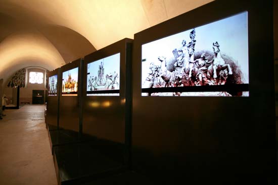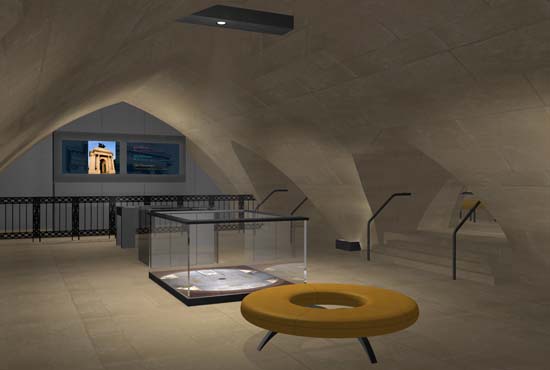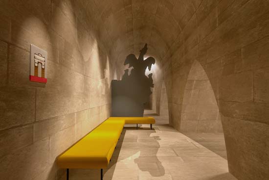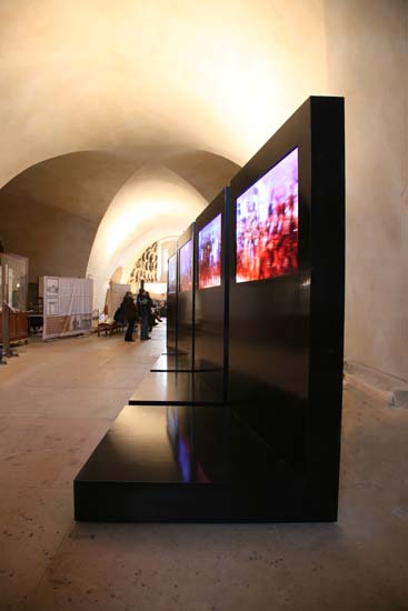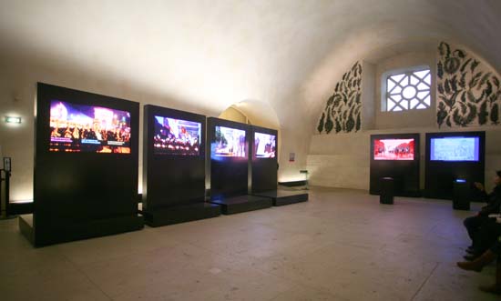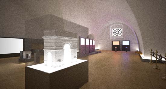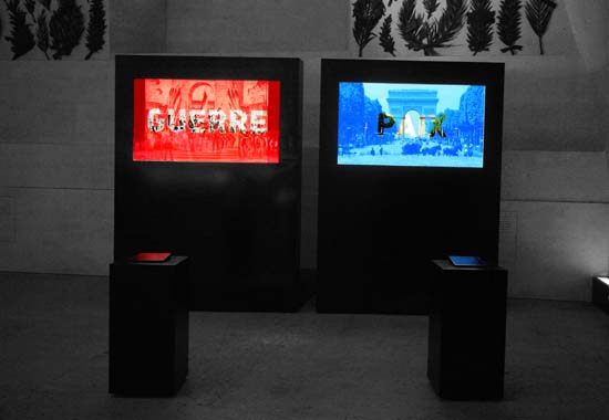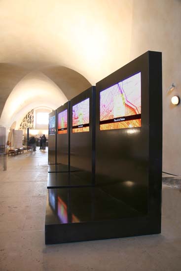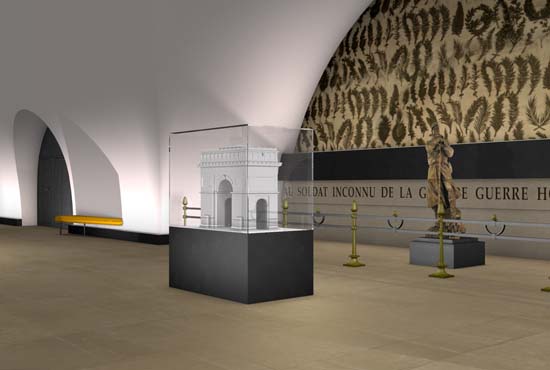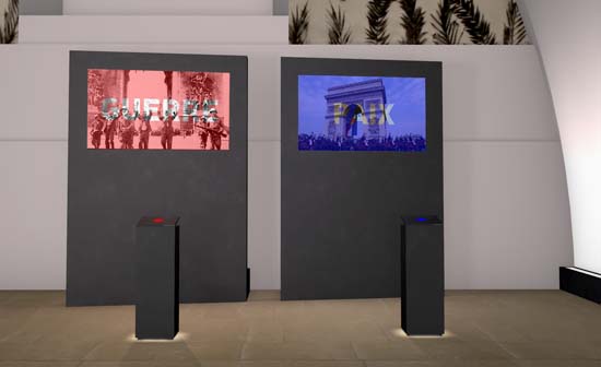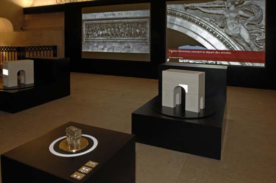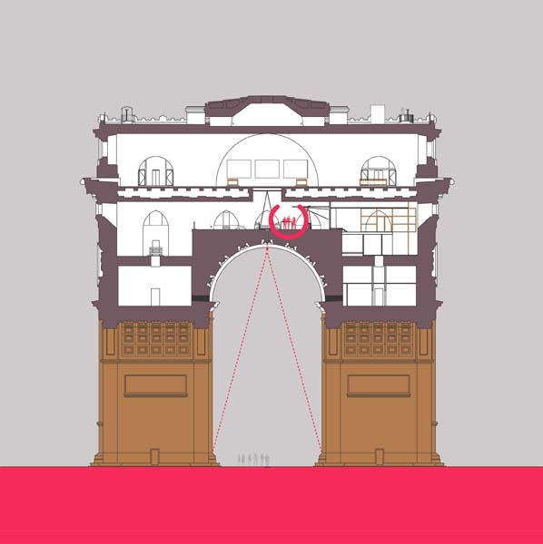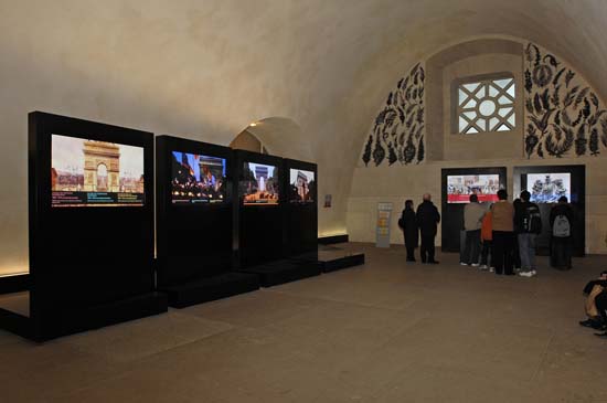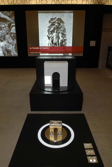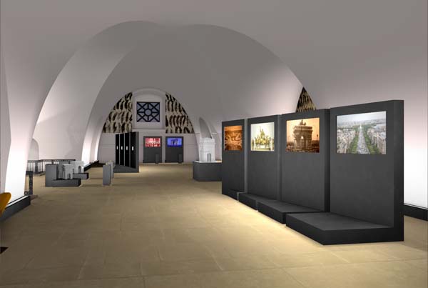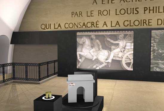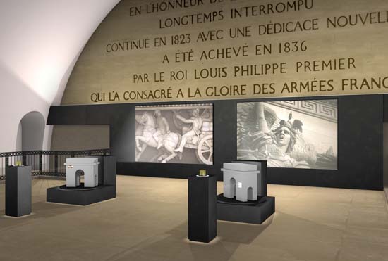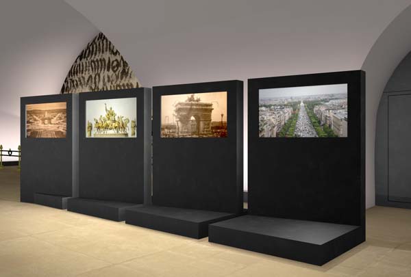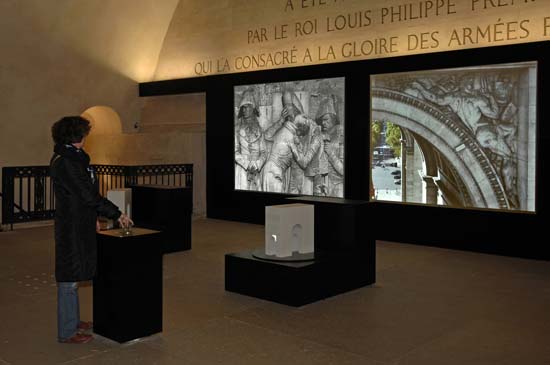 Arc de Triomphe, Paris 2008-... opening February 11, 2008 Exhibition conception and design for the 200 years of the Arc de Triomphe Conception and project management Maurice Benayoun (Artist) and Christophe Girault (Architect) Scénographie permanente de l'Arc de Triomphe Deux siècles depuis la première pierre, il est temps de s'interroger sur la signification de cet objet urbain qui impose son évidence massive en une place majeure de la capitale. C'est aussi l'occasion de s'interroger sur la place des objets symboliques monumentaux dans nos sociétés aux valeurs en perpétuelle mutation. Un pari accepté par le Centre des Monuments Nationaux quand il a retenu le projet pourtant à risque : discuter de la symbolique, donner à vivre plus que donner à voir, faire osciller, en image, le monument entre Guerres et Paix, sculpter et scruter le décor du regard, Arc en main, faisant tournoyer les fragments d'histoire pétrifiée. Pour l'Arc de Triomphe, la symbolique à glissé avec le temps du projet initial : un monument à la gloire de la Grande Armée , devenu monument de célébration nationale, en passant par le retour des cendres de Napoléon et l'enterrement de Victor Hugo pour devenir le mausolée du soldat inconnu, dernier mort de la "der des der", celui qui de son corps referme la porte de la guerre faute d'être celle de la victoire. Ce geste aurait dû inaugurer une période qui privilégie les valeurs de paix et de fraternité, plus en harmonie avec une époque et une culture qui préfère le dialogue au combat. La nouvelle scénographie s'efforce de poser les questions actuelles à la lumière de l'histoire. Monumentalité et statuaire Le monument en impose tellement qu'il maintient à distance. Il est peu de points de vue qui permettent d'en observer correctement à l'œil nu la statuaire. Le parisien ne s'y trompe pas qui ignore superbement le monument qu'il perçoit isolé sur son îlot cerné par un flot automobile peu accueillant. Seul le touriste sait qu'il existe un espace intérieur de l'Arc en attente fonction. L'approche scénographique Trois matériaux ont été privilégiés : L'acier, le cuir et l'image. Fil de cuir jaune qui accueille et guide le visiteur, 15 tonnes d'acier pour ancrer l'image dans la pierre. Les dispositifs de présentation se distinguent résolument du monument. Par leur forme monolithique, plus installation sculpturale faite de blocs d'acier que cimaises, ils assument leur altérité et rythment par la géométrie et par l'image l'espace ascétique de l'Arc. Ils ne sont plus supports; leur volume tranche l'image/lumière/mémoire comme des fragments de message en attente de lecteur. Parfois documentaires parfois innovants, les dispositifs multimédias confrontent les échelles, les symboles, les époques, les personnes. Le clinamen Lucrèce serait surpris de retrouver l'oblique en travers de l'axe historique qui du Louvre à Saint Germain dessine des parallèles enchaînant obélisque et arcs pour converger au soleil couchant. Le dispositif, la Grande Oblique coupe l'espace cruciforme de la salle de l'Attique comme pour permettre la rencontre entre des sens et des personnes qui n'auraient jamais dû se croiser. Cette oblique est aussi dans l'axe du méridien, une façon de ressituer le monument par rapport au monde et non par rapport au pouvoir. Le point de vue, un dispositif évolutif L'arc de Triomphe, au centre de l'Étoile, est un point de vue imposé sur la ville. De là, elle se donne à lire de manière différente et il fallait proposer des pistes d'interprétation. Un dispositif d'observation, télescope de "réalité augmentée", probablement le premier du genre en installation permanente, permet aux visiteurs de découvrir la ville et de mettre un nom sur les sites et les édifices. Ces télescopes permettront aussi plus tard de découvrir d'autres lectures: historiques, géographiques, ludiques ou poétiques. Une muséographie permanente qui s'actualise avec l'histoire. Fondée sur des dispositifs dynamiques parfois interactifs, la scénographie autorise une évolution du contenu pour prendre en compte l'évolution de la symbolique du monument et de son interprétation, que l'on aurait cru figée dans la pierre, mais aussi pour permettre une adaptation ponctuelle aux événements. Un observatoire privilégié du devenir urbain Parallèlement à leur fonction informative, les dispositifs de la terrasse constituent une plateforme d'expérimentation sur les nouvelles formes d'écritures qui de l'histoire au patrimoine, en passant par l'urbanisme et la création artistique feront de l'Arc un observatoire permanent des dynamiques urbaines. Le partenariat scientifique entre le Citu (Universités Paris 1 et Paris 8) et le Centre des Monuments Nationaux , établi sur la durée, inaugure une recherche en profondeur sur ces questions. M. Benayoun Ch. Girault émission Vivre sa ville, sur France Culture, samedi 13 juillet 2008 La nouvelle scénographie permanente de l'Arc de Triomphe de Paris Interviews de Jean Paul CIRET, Maurice BENAYOUN, Christophe GIRAULT par Sylvie Andreu Realisation : Véronique Vila |