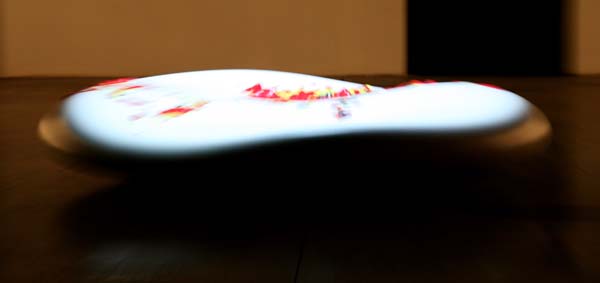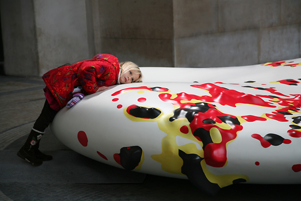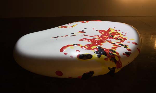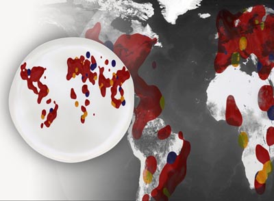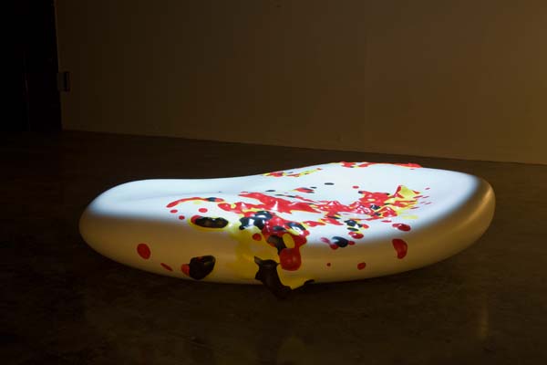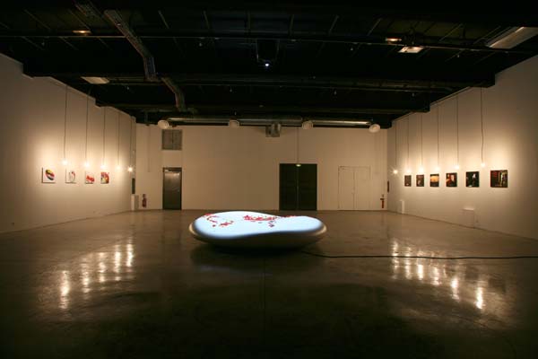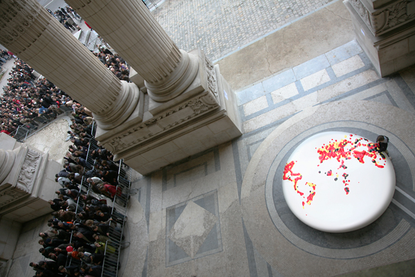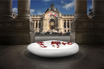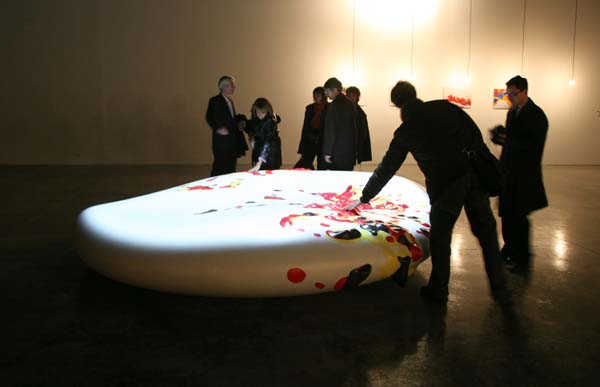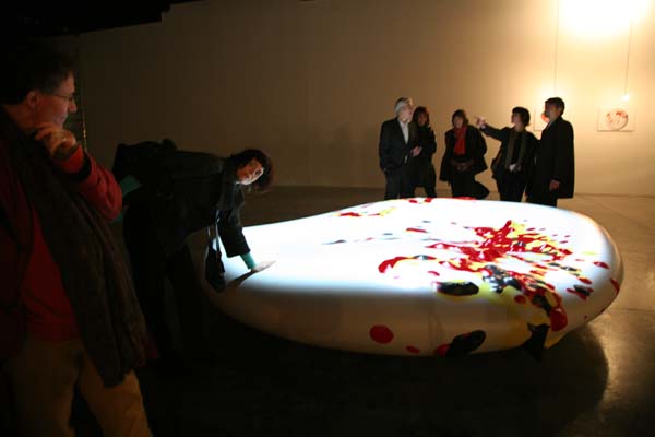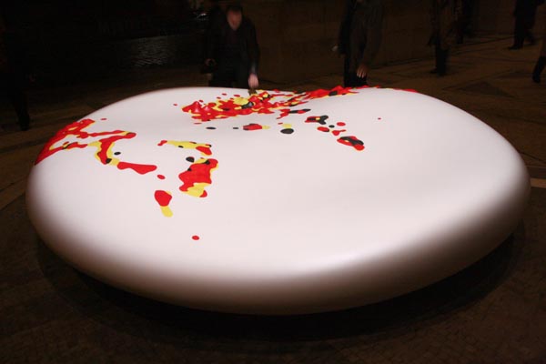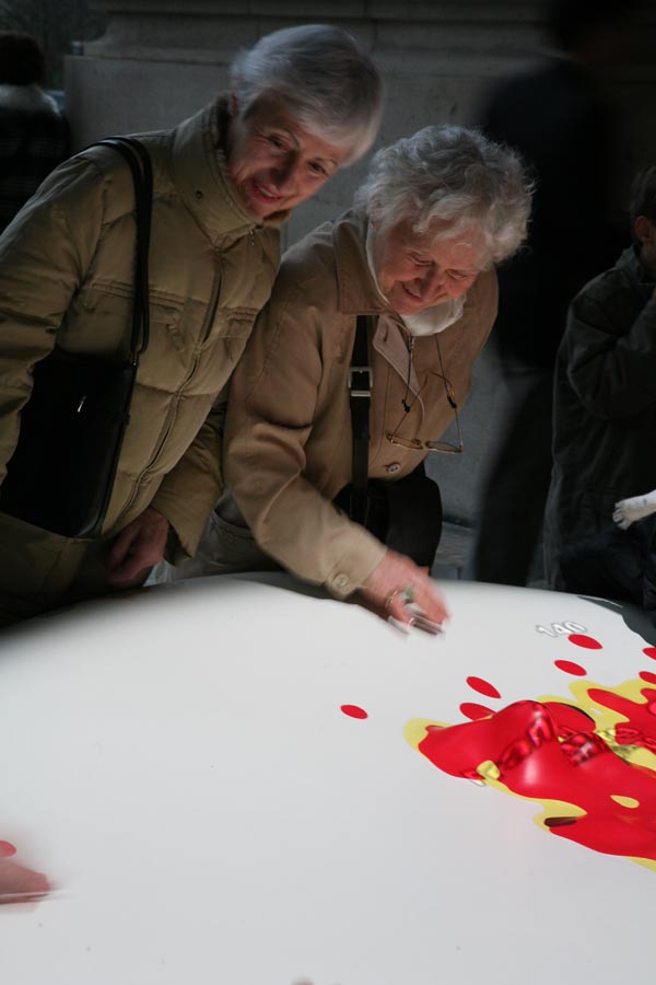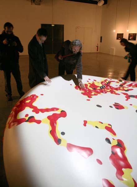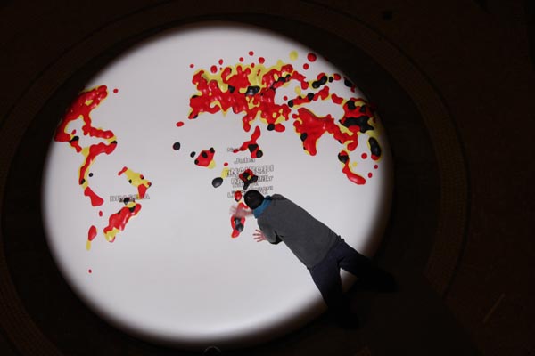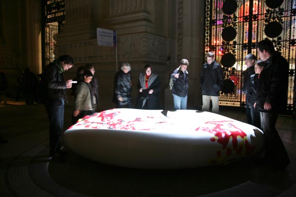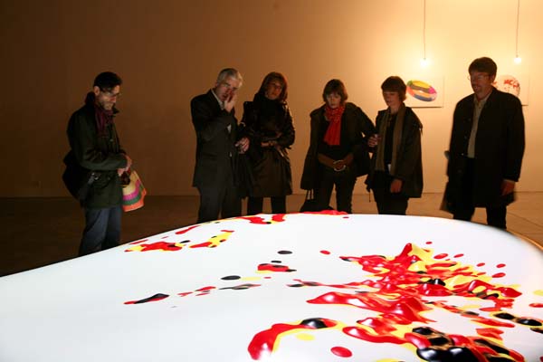 For its first exhibition, this installation by Maurice Benayoun was placed at the entrance of one of the biggest Parisian monuments: le Grand Palais, in the frame of the European city of Sciences event, November 14- 16, 2008. Upon your entrance, you get into the Mechanics of Emotions, confronted to a sculpture which produces an infrasonic music when you touch it, composed by digital data coming from more than 3000 biggest cities of the world. Maurice Benayoun invites you to explore the representation modalities of the planet affects. Still Moving, The Mechanics of Emotions Still Moving is an interactive piece of art, made of a dynamic sculpture of 3,5m diameter and 0,9m high, sounds and video projection. When touching it, Still moving produces a music made of infrasound (5 to 20 Hz, that you can only perceive with your body). Conceived by Maurice Benayoun in the frame of a series of works on the Mechanics of emotions, this sculpture is built out of digital data, coming from the web analysis of the relation between 3200 cities around the world and a lexical corpus related to the emotions. Still moving is a snapshot of the map of world emotions, sculpted from internet data. Still Moving is presented as the deflated globe of an earth, whose relief wouldn’t be related to geology, but to emotional intensities variations spotted on the internet. This apparently still volume, is “still moving” when touching it. The infrasonic music depends on the geographic areas touched by the visitor. The data and graphic representations are projected simultaneously on the sculpture, making the interrelationships between the world, the digital data and the visitor’s movements intelligible. Public commission of the Ministry of Culture Délégation aux Arts Plastiques, the sketches for this piece of art become part of the Contemporary Art national fund (FNAC). Still Moving has been co-produced and co-presented by Arcadi regional support program of Ile de France. The information conveyed by the search engines, brings us daily a system of responses, which is supposed to reflect a sociologic, geographic, scientific reality. But, this system is affected by a linguistic (English language predominance) and technologic (geographic predominance of industrialised areas) filtering. Which representation of the world can we obtain through the network? Too often considered as the world nervous system, the Internet seems to neglect the phantom limbs of the planetary system: Africa, becoming an archipel, is far from the reality of the continent, as an amputated limb, from which you would even not feel the ghost pains. Mechanics of Emotions explore the world affects representation modalities, considered as a global body. This work interrogates the actual limits of the representation system and the new interpretative filtering process.